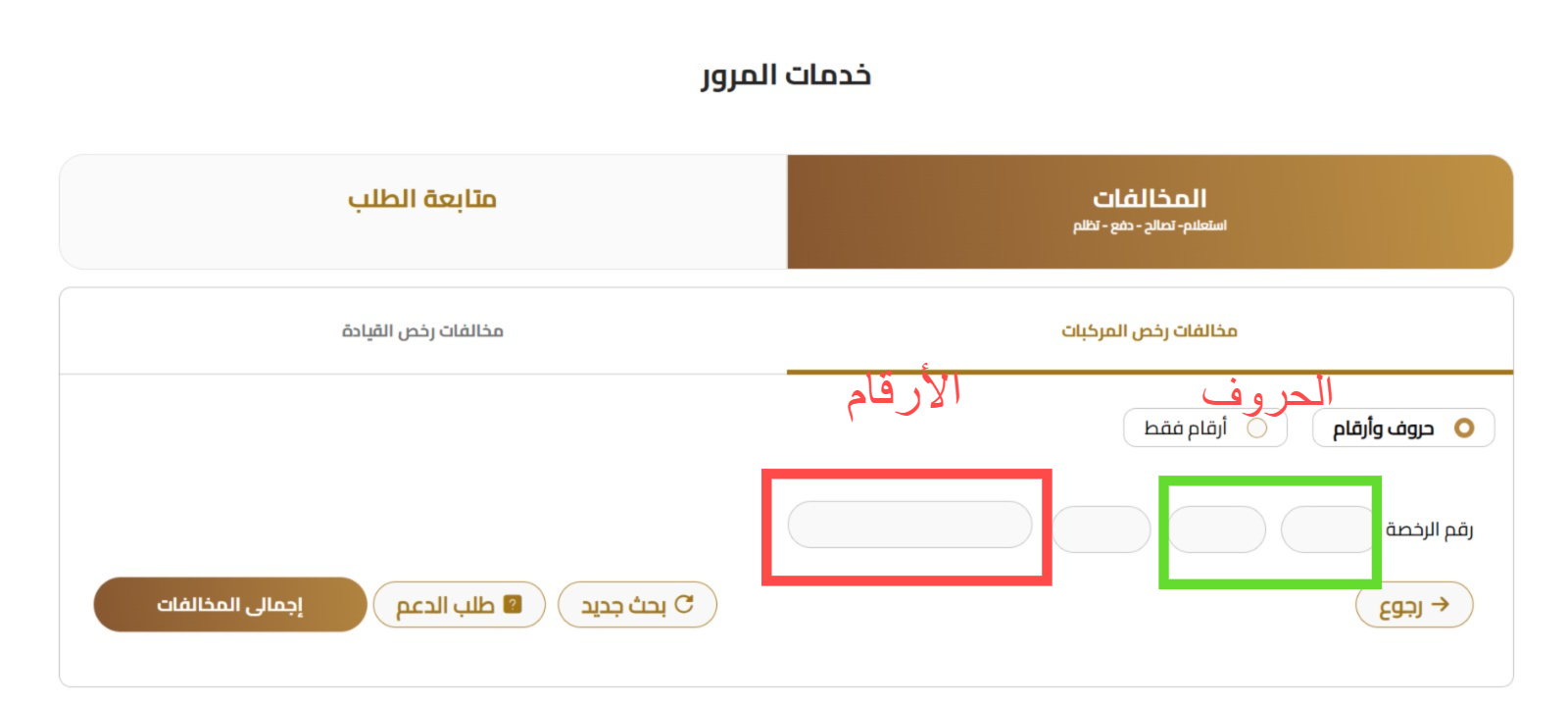 - قم بكتابة رقم الرخصة الخاصة بمركبتك التي ترغب في الاستعلام عنها كما هو موضح بالصورة.