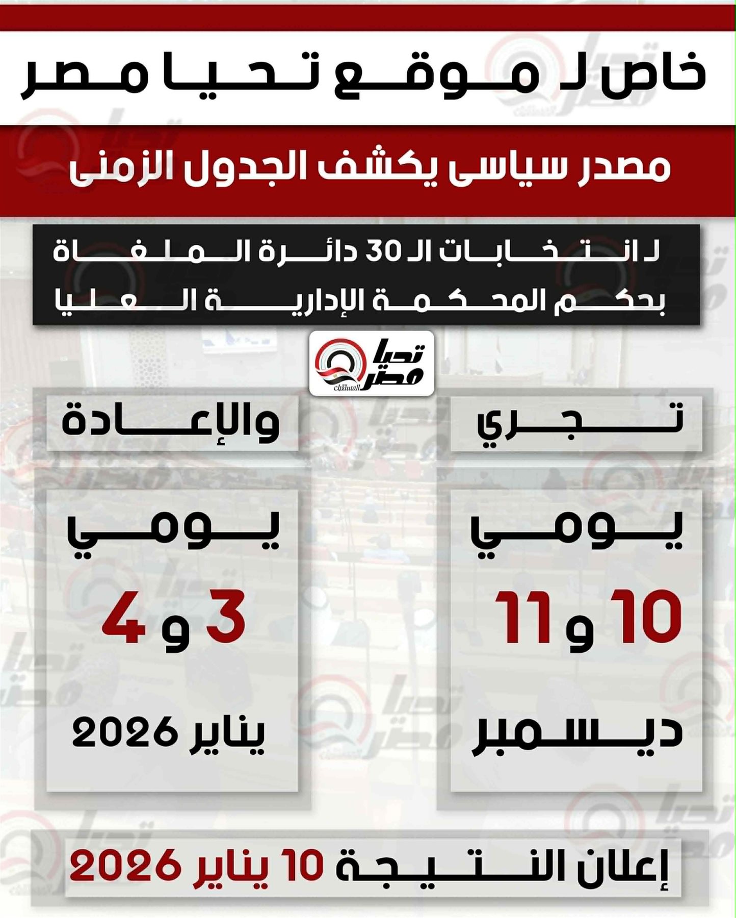 وكشف المصدر أن جولة الإعادة لتلك الدوائر الملغاة سوف يكون في يومي 1 و 2 يناير 2026.