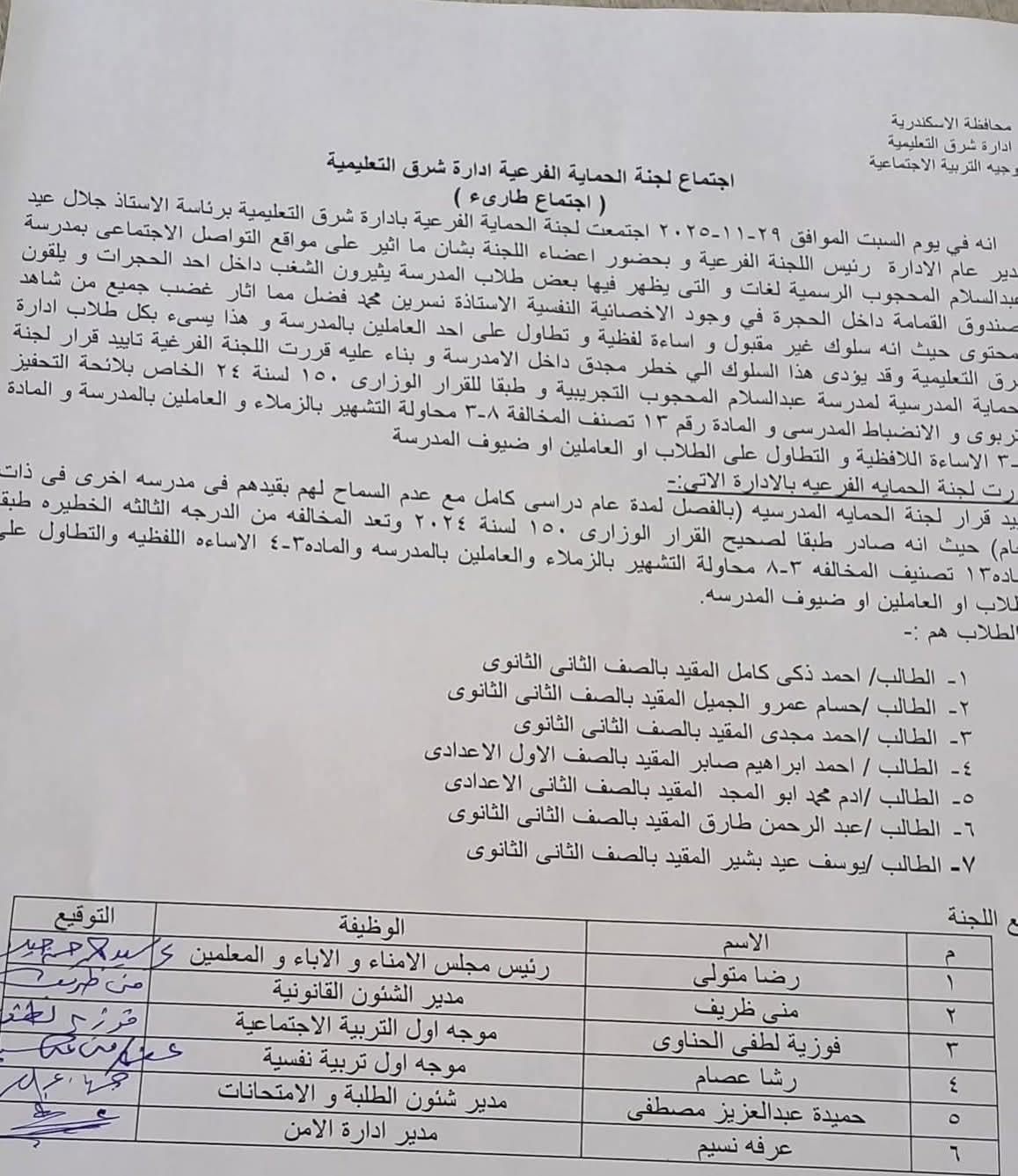 ةعقدت لجنة الحماية الفرعية بإدارة شرق الإسكندرية التعليمية، اجتماعًا طارئًا برئاسة جلال عيد، مدير عام الإدارة ورئيس اللجنة، بحضور أعضاء اللجنة، لمناقشة الواقعة المثيرة للجدل التي انتشرت على مواقع التواصل الاجتماعي داخل مدرسة عبد السلام المحجوب الرسمية لغات وجاء الاجتماع حضور رضا متولي رئيس مجلس الأمناء والآباء والمعلمين ومنى ظريف مدير الشئون القانونية وفوزية لطفي الحناوي موجه أول التربية الاجتماعية رشا عصام موجه أول التربية النفسية وحميدة عبد العزيز مصطفى مدير شئون الطلاب والامتحانات وعرفه نسيم مدير إدارة الأمن.