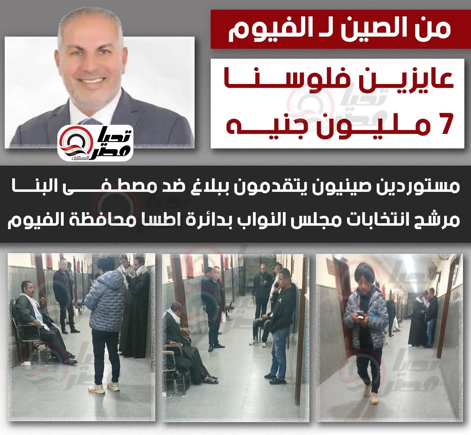 مستوردين صينيون يتقدمون ببلاغ ضد مصطفى البنا مرشح انتخابات مجلس النواب بدائرة اطسا محافظة الفيوم