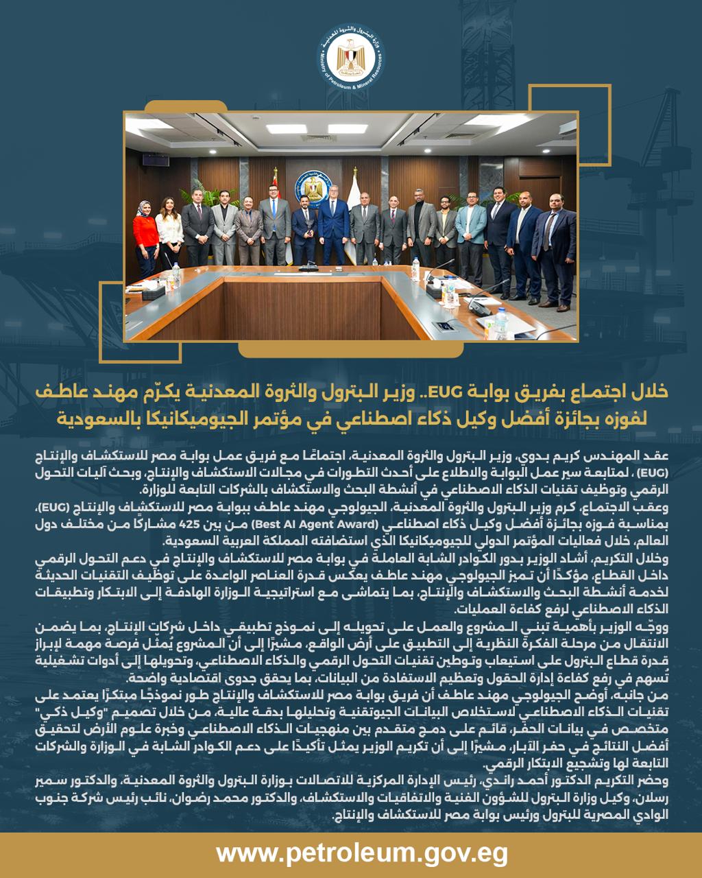 وعقب الاجتماع، كرم وزير البترول والثروة المعدنية، الجيولوجي مهند عاطف ببوابة مصر للاستكشاف والإنتاج (EUG)، بمناسبة فوزه بجائزة أفضل وكيل ذكاء اصطناعي (Best AI Agent Award) من بين 425 مشاركًا من مختلف دول العالم، خلال فعاليات المؤتمر الدولي للجيوميكانيكا الذي استضافته المملكة العربية السعودية.
