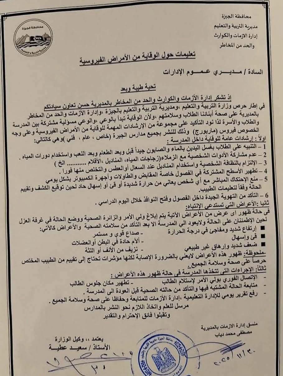 عاجل.. تعليمات «تعليم الجيزة» لحماية الطلاب من فيروس ماربورج