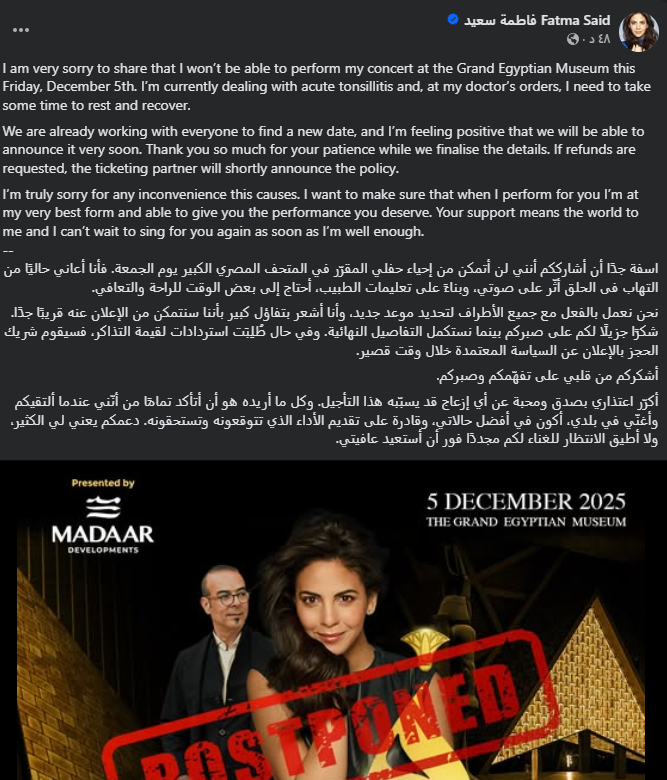 أعتذرت السوبرانو فاطمة سعيد، عن إحياء حفلها الذي كان من المقرر أن يقام غدا الجمعة 5 من ديسمبر، بالمتحف المصري الكبير، مشيرة انها اعتذارها جاء بناءً على تعليمات الطبيب.
