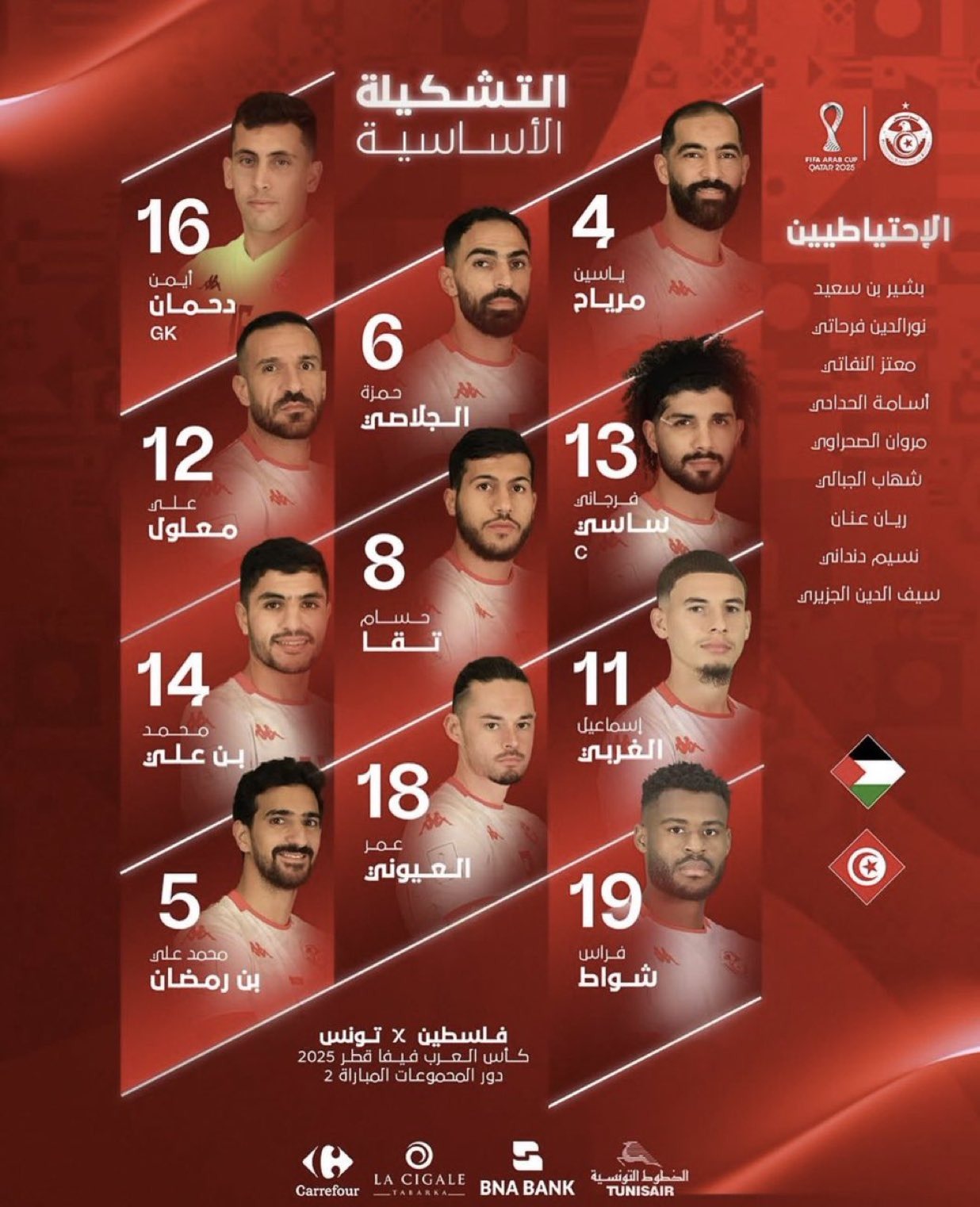 وأعلن إيهاب أبو جزر المدير الفني لمنتخب فلسطين عن التشكيل الرسمي الذي سيخوض به المواجهة أمام تونس، حيث تصدر حامد حمدان لاعب بتروجت المشهد ضمن التشكيل الأساسي.