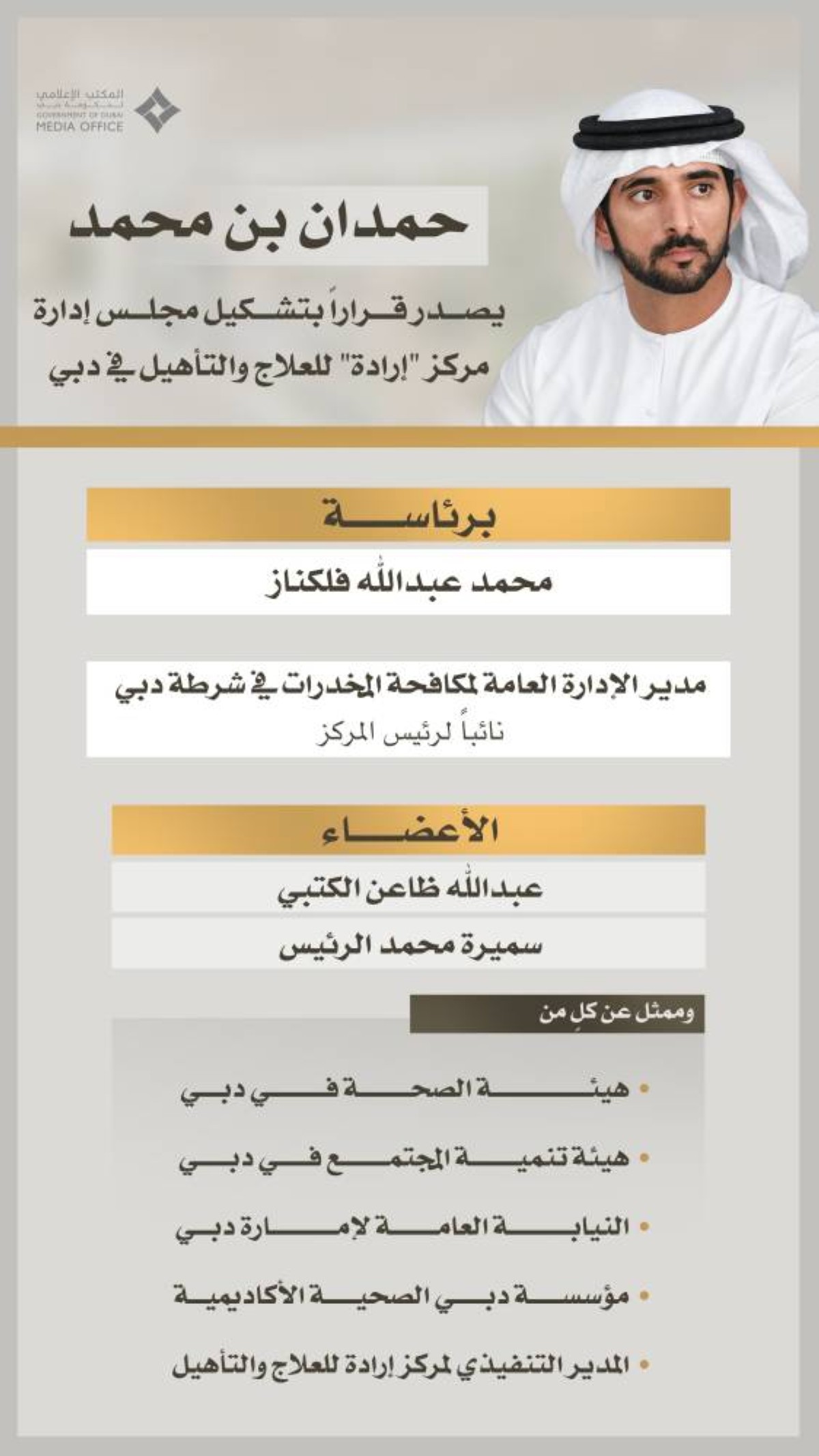 ويضم المجلس، حسب القرار، كلاً من: مدير الإدارة العامة لمكافحة المخدرات في شرطة دبي، نائباً لرئيس المركز، والأعضاء: عبدالله ظاعن عبيد الكتبي، وسميرة محمد الرئيس، وممثل عن كلٍ من: هيئة الصحة في دبي، وهيئة تنمية المجتمع في دبي، والنيابة العامة لإمارة دبي، ومؤسسة دبي الصحية الأكاديمية، والمدير التنفيذي لمركز إرادة للعلاج والتأهيل. ويُعمل بهذا القرار من تاريخ صدوره، ويُنشر في الجريدة الرسمية.