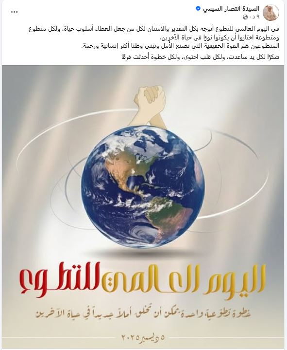 وقالت السيدة انتصار السيسي في تدوينتها إن المتطوعين هم «القوة الحقيقية التي تصنع الأمل وتبني وطنًا أكثر إنسانية ورحمة»، مضيفة أن كل متطوع ومتطوعة اختاروا أن يجعلوا العطاء أسلوب حياة، ويكونوا نورًا في حياة الآخرين، يستحقون كل الشكر والتقدير على جهودهم النبيلة.