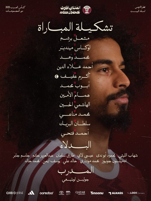 التشكيل الرسمي لمباراة منتخب قطر وتونس في كأس العرب 2025
