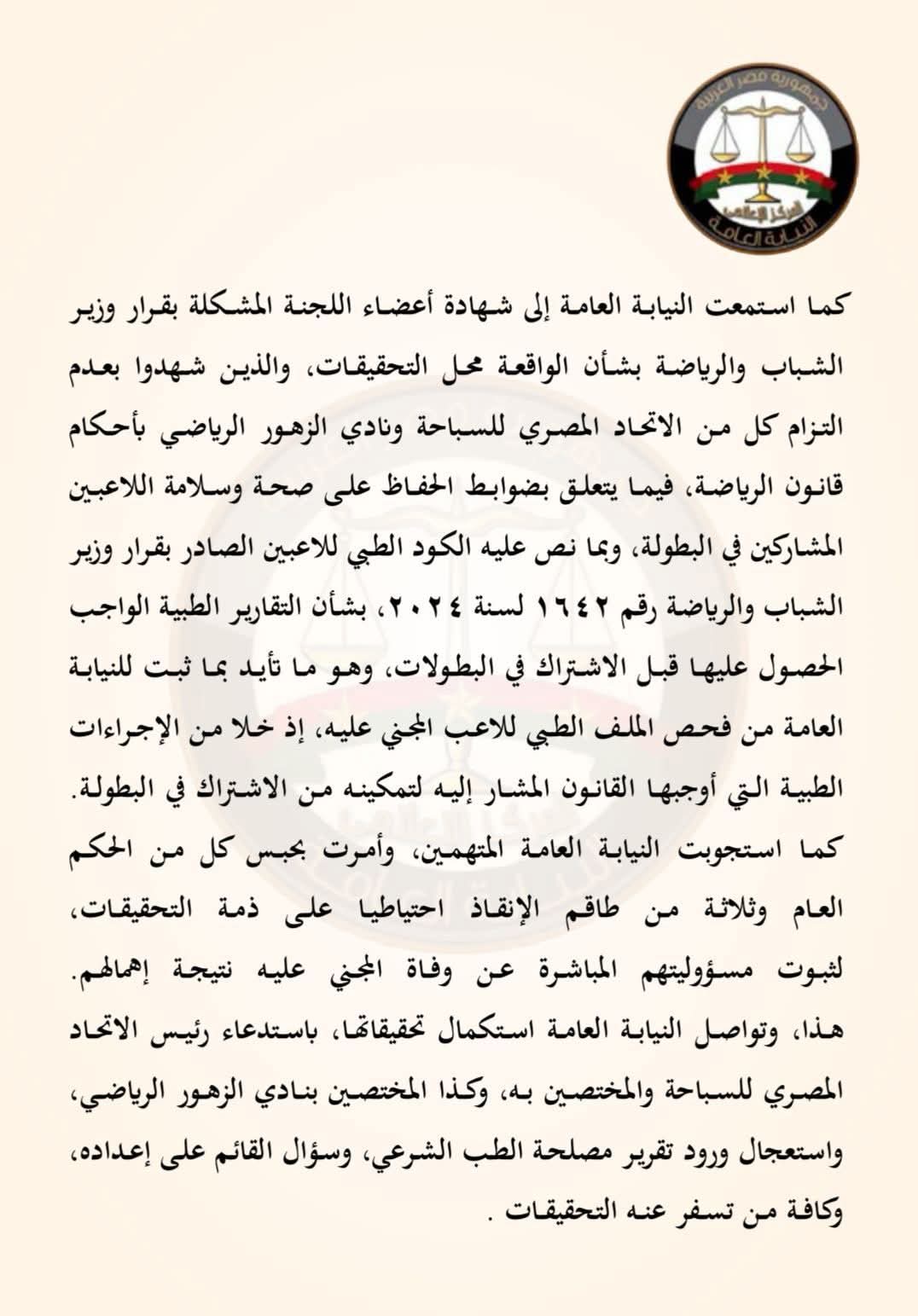 كما استمعت النيابة العامة إلى شهادة أعضاء اللجنة المشكلة بقرار وزير الشباب والرياضة بشأن الواقعة محل التحقيقات والذين شهدوا بعدم التزام كل من الاتحاد المصري للسباحة ونادي الزهور الرياضي بأحكام قانون الرياضة فيما يتعلق بضوابط الحفاظ على صحة وسلامة اللاعبين المشاركين في البطولة، وبما نص عليه الكود الطبي للاعبين الصادر بقرار وزير الشباب والرياضة رقم ١٦٤٢ لسنة ۲۰۲٤ ، بشأن التقارير الطبية الواجب الحصول عليها قبل الاشتراك في البطولات، وهو ما تأيد بما ثبت للنيابة العامة من فحص الملف الطبي للاعب المجني عليه، إذ خلا من الإجراءات الطبية التي أوجبها القانون المشار إليه لتمكينه من الاشتراك في البطولة.