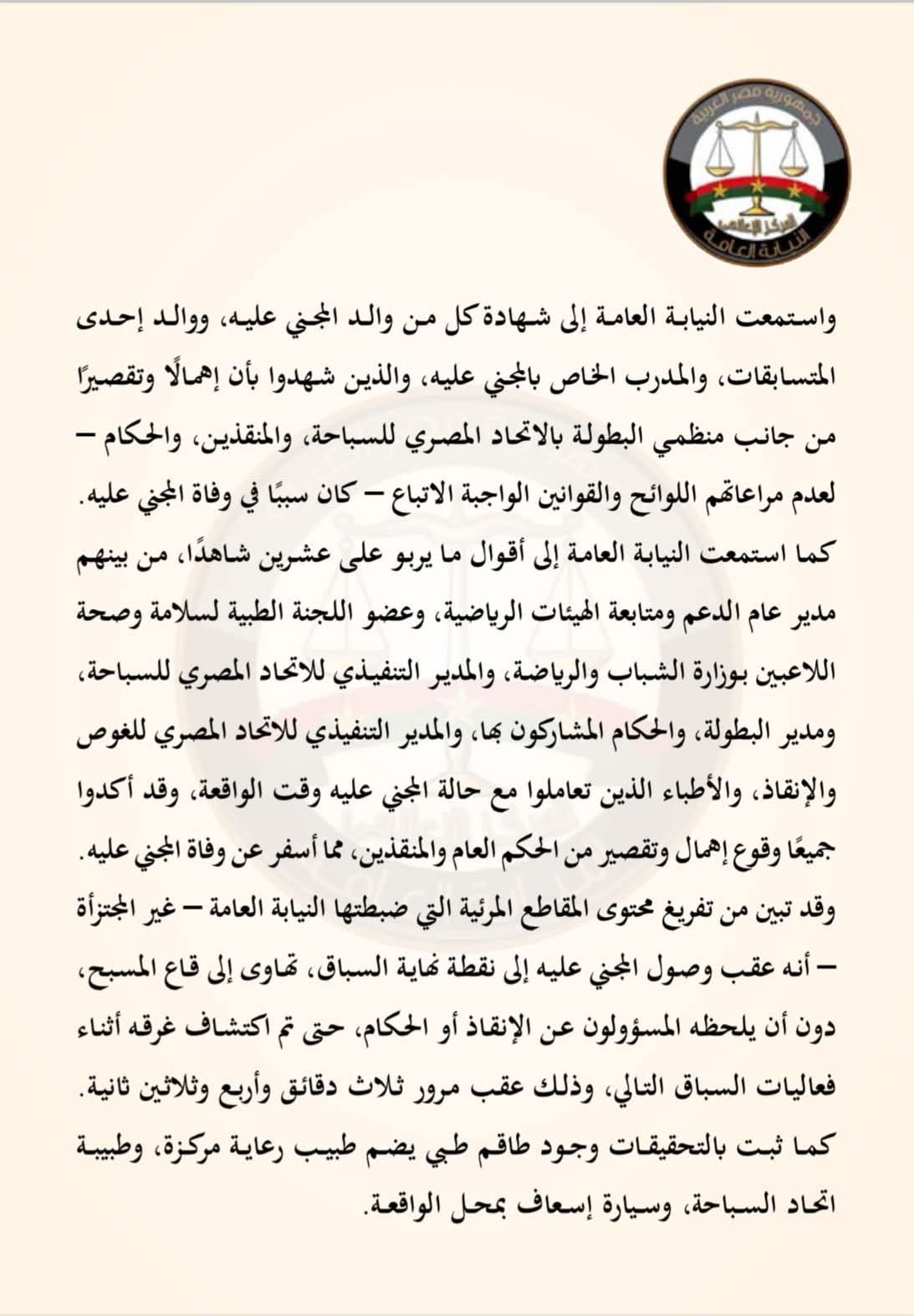 كما استمعت النيابة العامة إلى أقوال ما يربو على عشرين شاهدًا، من بينهم مدير عام الدعم ومتابعة الهيئات الرياضية، وعضو اللجنة الطبية لسلامة وصحة اللاعبين بوزارة الشباب والرياضة، والمدير التنفيذي للاتحاد المصري للسباحة ومدير البطولة، والحكام المشاركون بها، والمدير التنفيذي للاتحاد المصري للغوص والإنقاذ، والأطباء الذين تعاملوا مع حالة المجني عليه وقت الواقعة، وقد أكدوا جميعًا وقوع إهمال وتقصير من الحكم العام والمنقذين، مما أسفر عن وفاة المجني عليه. وقد تبين من تفريغ محتوى المقاطع المرئية التي ضبطتها النيابة العامة – غير المجتزأة أنه عقب وصول المجني عليه إلى نقطة نهاية السباق، تهاوى إلى قاع المسبحدون أن يلحظه المسؤولون عن الإنقاذ أو الحكام، حتى تم اكتشاف غرقه أثناء فعاليات السباق التالي، وذلك عقب مرور ثلاث دقائق وأربع وثلاثين ثانية. كما ثبت بالتحقيقات وجود طاقم طبي يضم طبيب رعاية مركزة، وطبيبة اتحاد السباحة، وسيارة إسعاف بمحل الواقعة.