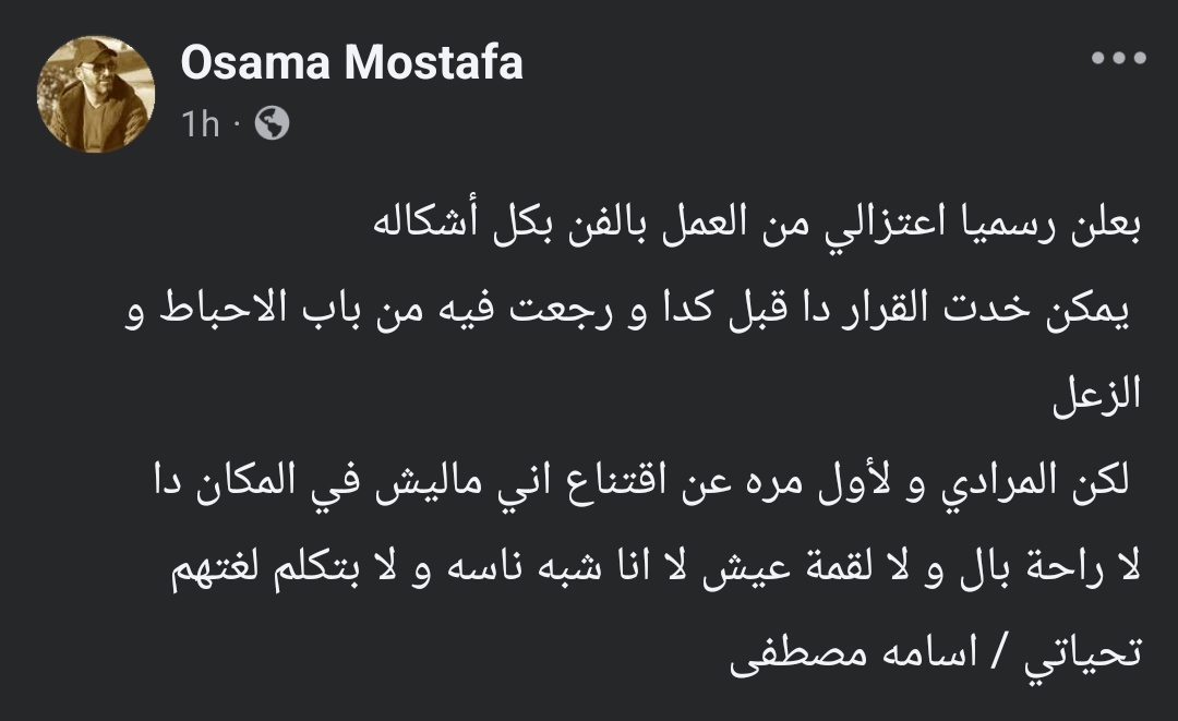ولم تكن هذه المرة الأولى التي يعلن فيها أسامة مصطفى اعتزاله، إذ سبق وأعلن اعتزاله مرتين من قبل، وكان كتب خلال عام 2024 منشورًا مشابهًا قال فيه: