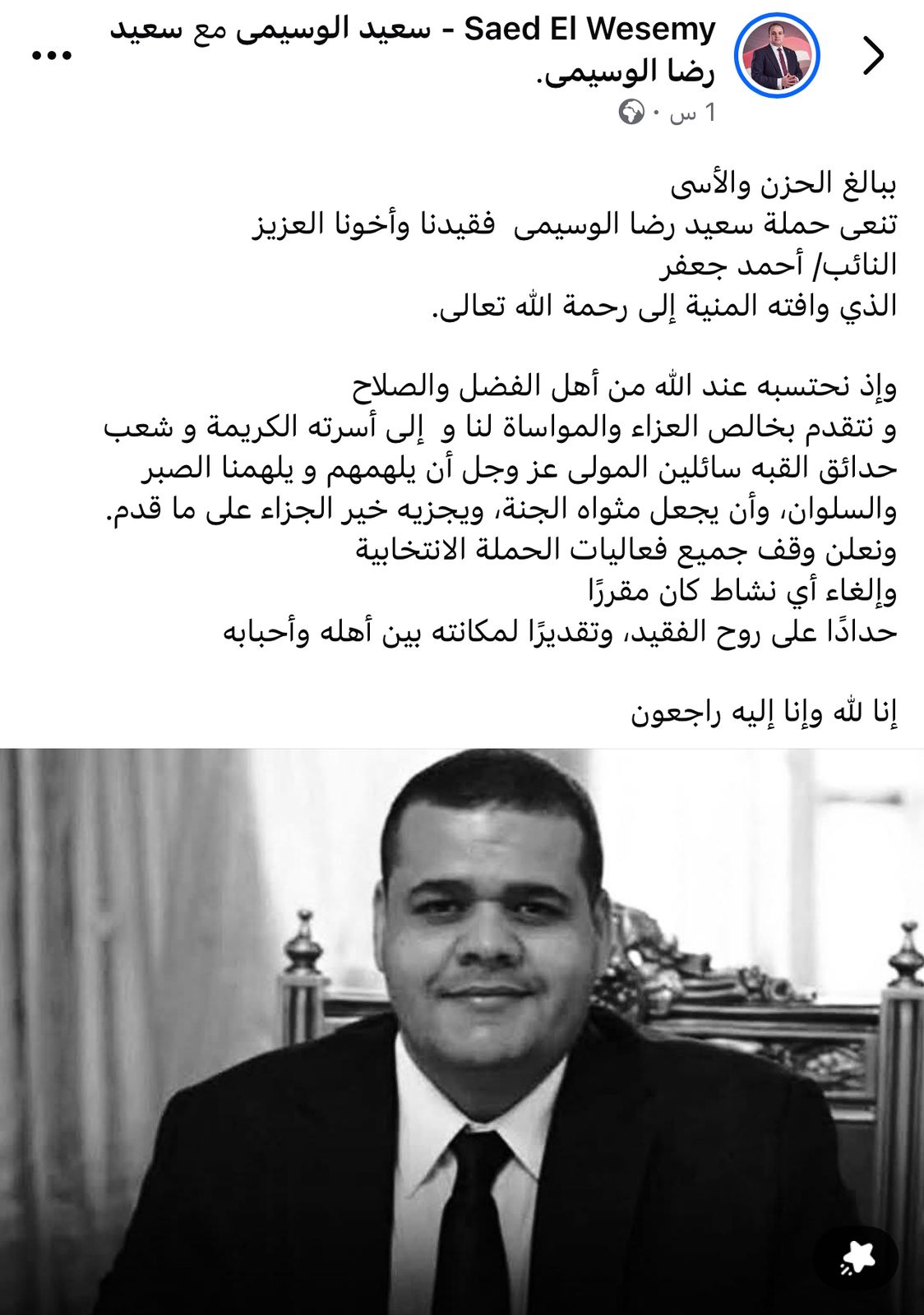 وقال سعيد الوسيمي مرشح حزب المؤتمر بدائرة حدائق القبة خلال منشور له على فيس بوك “ببالغ الحزن والأسى: ”تنعى حملة سعيد رضا الوسيمى فقيدنا وأخونا العزيز النائب/ أحمد جعفر الذي وافته المنية إلى رحمة الله تعالى. وإذ نحتسبه عند الله من أهل الفضل والصلاح و نتقدم بخالص العزاء والمواساة لنا و إلى أسرته الكريمة و شعب حدائق القبه سائلين المولى عز وجل أن يلهمهم و يلهمنا الصبر والسلوان، وأن يجعل مثواه الجنة، ويجزيه خير الجزاء على ما قدم. ونعلن وقف جميع فعاليات الحملة الانتخابية وإلغاء أي نشاط كان مقررًا حدادًا على روح الفقيد، وتقديرًا لمكانته بين أهله وأحبابه،إنا لله وإنا إليه راجعون”.