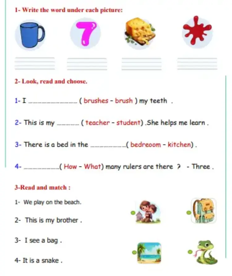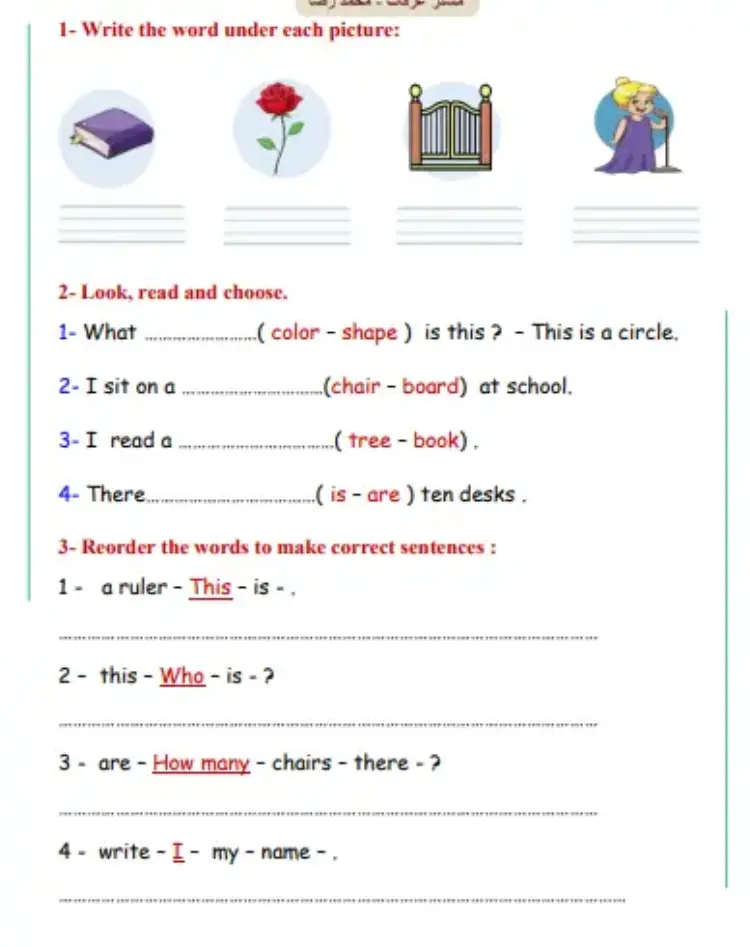 1- Write the word under each picture (اكتب الكلمة تحت كل صورة):