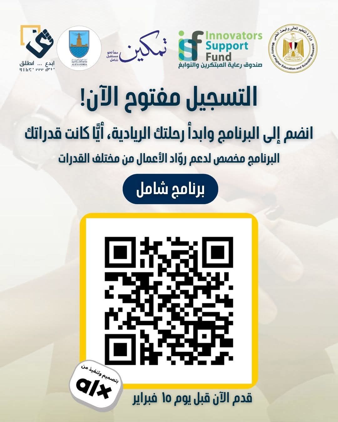 وأشارت جامعة الإسكندرية، إلى أن آخر موعد للتقديم: 15 فبراير، وأن التقديم متاح من خلال جامعة الإسكندرية، وذلك بالشراكة مع وزارة التعليم العالي والبحث العلمي، وصندوق رعاية المبتكرين، ومؤسسة تمكين، ويمكن التقديم من خلال الـQR Code أو الدخول عبر الرابط التالي من (هنــــــــــــــا).