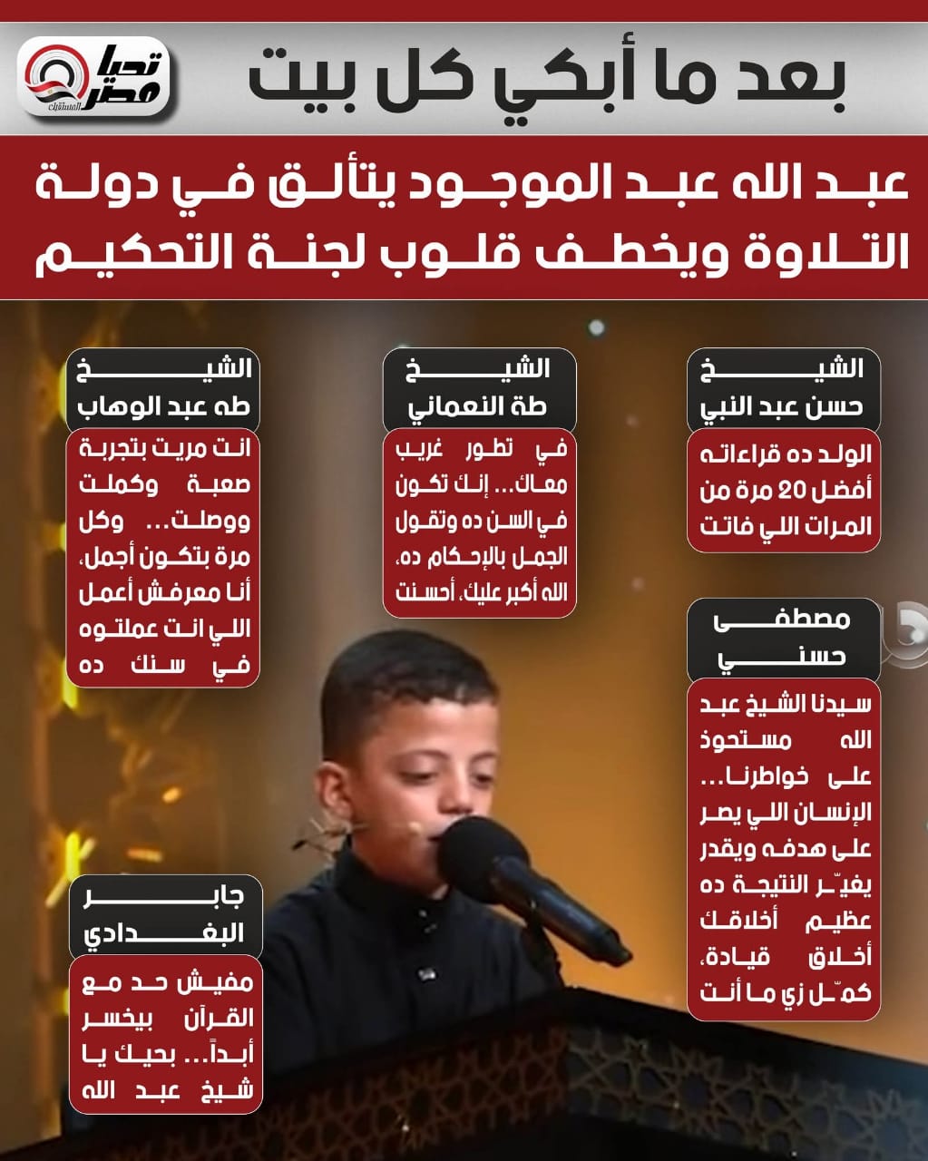 حقق الطفل الموهوب عبد الله عبد الموجود خلال إحدى حلقات برنامج دولة التلاوة أداءً قرآنيًا استثنائيًا نال إعجاب لجنة التحكيم والمشاهدين على حد سواء، حيث تميزت قراءاته بالتحسن الكبير والعمق الروحي الذي بدا واضحًا منذ لحظاته الأولى أمام الكاميرات.