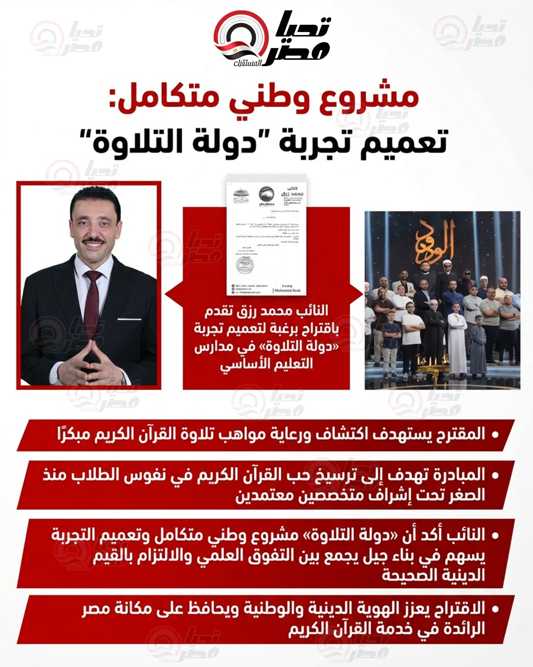 تقدم النائب الدكتور محمد رزق، عضو مجلس الشيوخ، باقتراح برغبة لدراسة تعميم تجربة دولة التلاوة في مدارس التعليم الأساسي، بالتعاون بين وزارتي التربية والتعليم والأوقاف، وذلك بهدف اكتشاف ورعاية مواهب تلاوة القرآن الكريم في مختلف المراحل العمرية، وترسيخ حب القرآن الكريم في نفوس الأبناء منذ الصغر، تحت إشراف متخصصين وعلماء معتمدين.