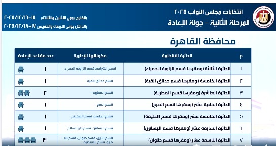 تفاصيل جولة الإعادة لانتخابات مجلس النواب في المرحلة الثانية بدوائر القاهرة