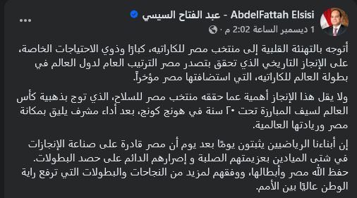 وجاءت تهنئات الرئيس عبد الفتاح السيسي خلال عام 2025 لتجسد تقدير الدولة لما يحققه أبطال الرياضة المصرية من إنجازات متتالية، ولتؤكد أن النجاحات الرياضية تحظى باهتمام ودعم على أعلى مستوى، في إطار إيمان راسخ بدور الرياضة في رفع اسم مصر، وإلهام الأجيال الجديدة، وترسيخ صورة مشرفة للوطن في مختلف المحافل الإقليمية والدولية.