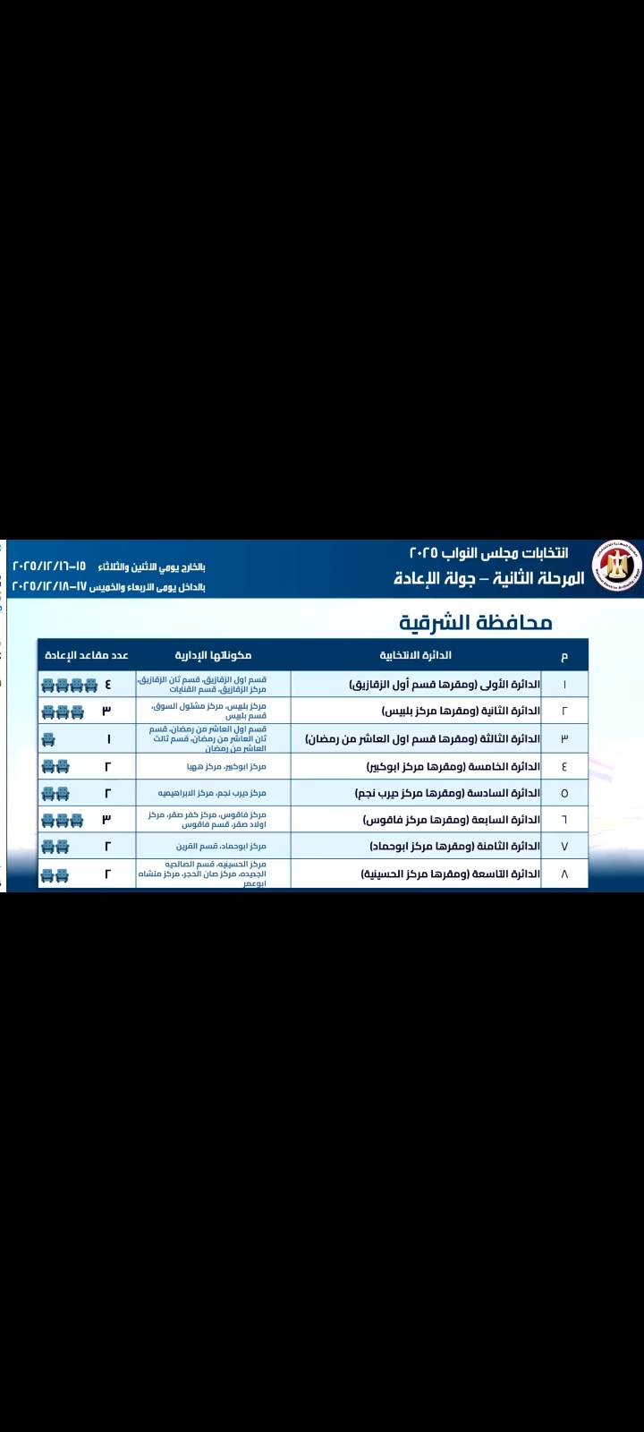 تفاصيل الدوائر وعدد المقاعد في الإعادة بمحافظة الشرقية: