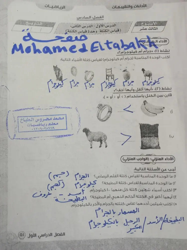 إجابة الأداء الصفي وواجب وتقييم الأسبوع الثالث عشر رياضيات للصف الثاني الابتدائي ترم أول 2026