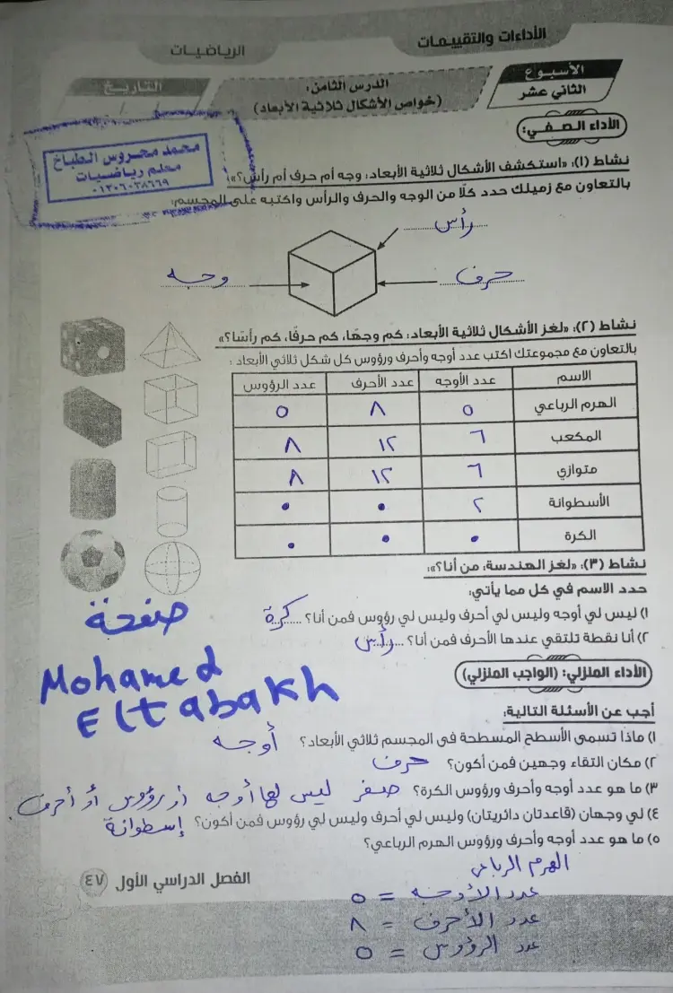 س 1: كم عدد أوجه المكعب؟ (اختر الإجابة الصحيحة)