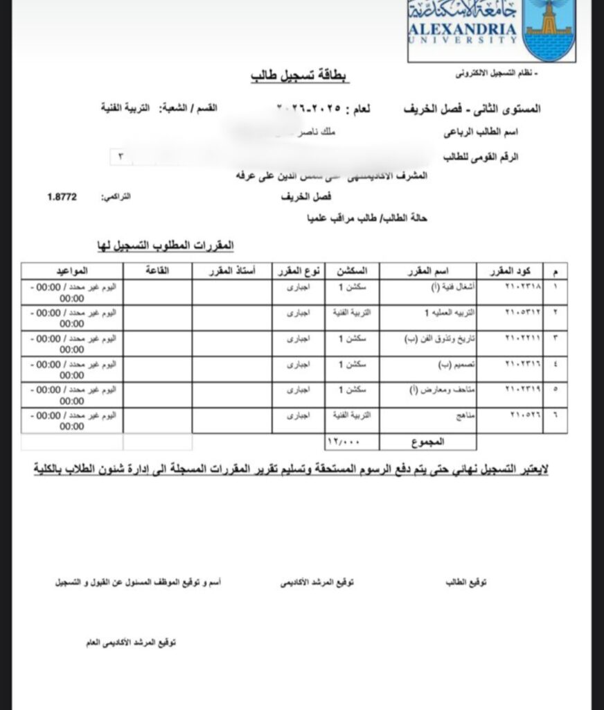 وأضافت الطالبة بالفرقة الثانية بكلية التربية النوعية جامعة الإسكندرية، أنه في العام الدراسي الماضي، تلقت أسرتها إنذارًا رسميًا من الكلية بضرورة إعادة التسجيل لتفادي الفصل النهائي، وهو ما دفعها إلى التحرك الفوري لإنهاء كافة الإجراءات المطلوبة.