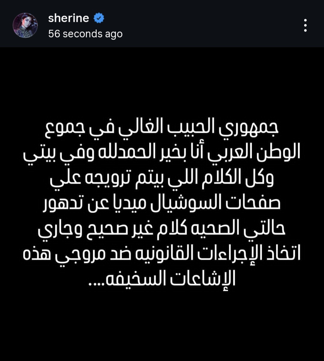 طمأنت الفنانة شيرين عبد الوهاب جمهورها، مؤكدة أنها بخير وفي منزلها، وأن ما يتم تداوله من شائعات عن تدهور حالتها الصحية عارٍ عن الصحة، وذلك في بيان رسمي لها عبر حساباتها على مواقع التواصل الاجتماعي.
