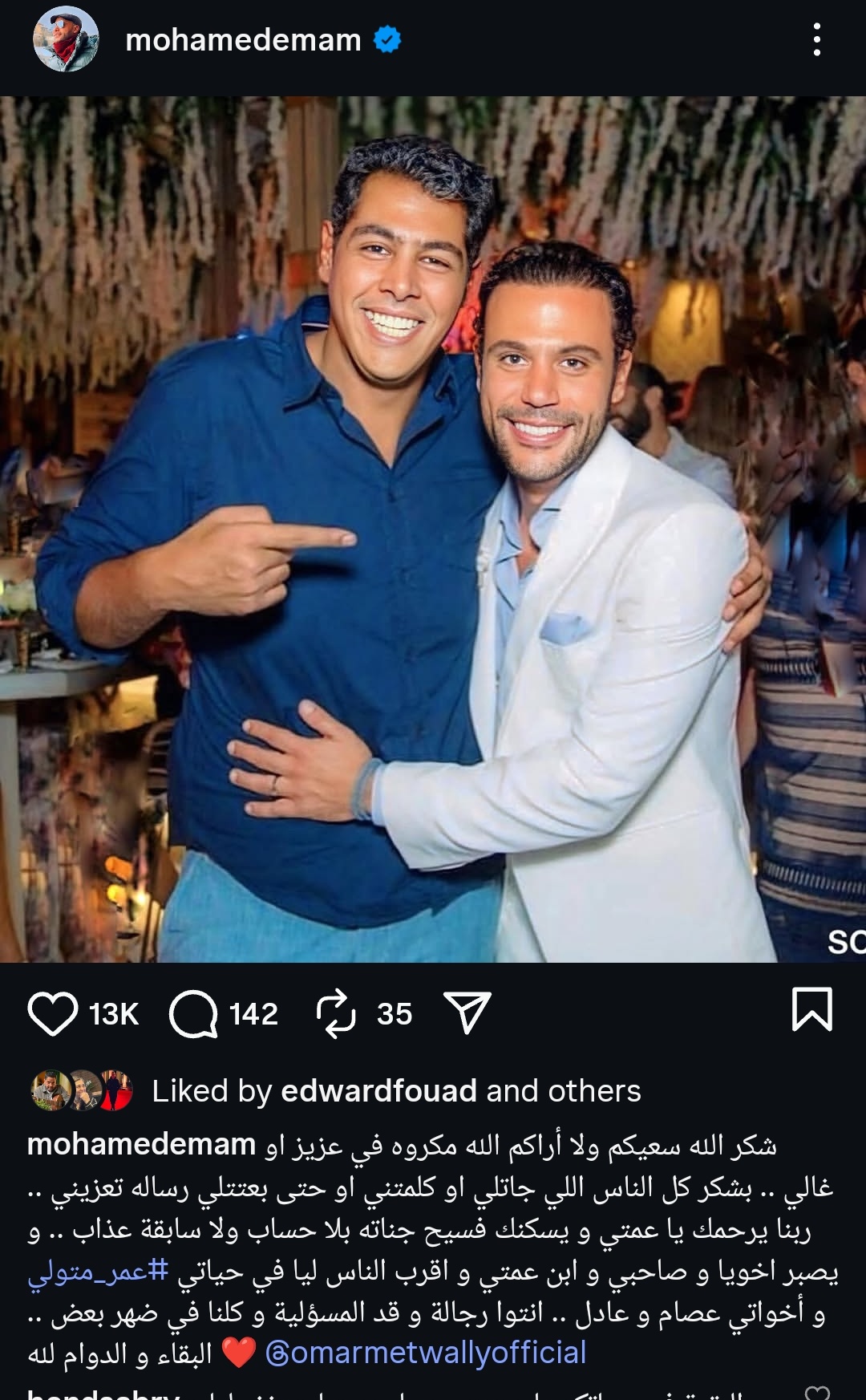 حرص الفنان محمد إمام على توجيه رسالة مؤثرة بعد انتهاء عزاء عمته إيمان إمام، عبّر خلالها عن امتنانه لكل من شاركه لحظات الحزن وسانده في هذا الظرف الإنساني الصعب، ونشر محمد إمام عبر حسابه الرسمي على موقع «إنستجرام» كلمات حملت مشاعر صادقة، قال فيها إن المواساة والدعم اللذين تلقاهما من الجمهور والأصدقاء خففا كثيرًا من وطأة الفقد.