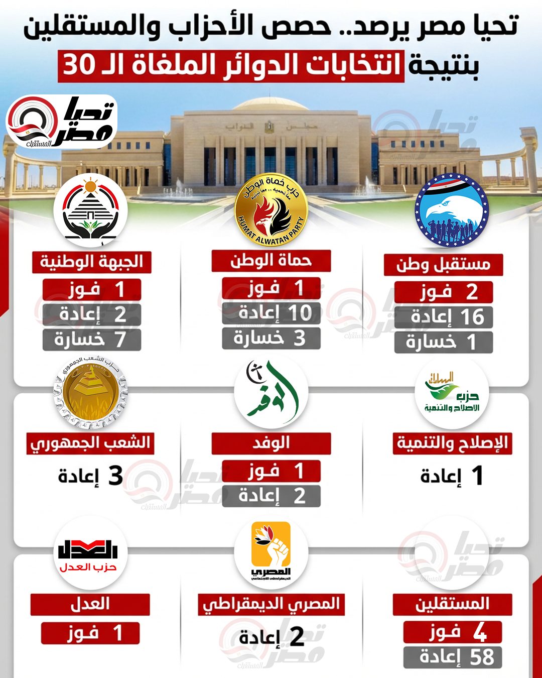 يرصد موقع تحيا حصص الاحزاب التي حصلت عليها في انتخابات الـ 30 دائرة الملغاة بهم الانتخابات بقرار من المحكمة الإدارية العليا في الجولة الاولى من المرحلة الاولى، إضافة إلى الحصص التي حصل عليها المستقلين.
