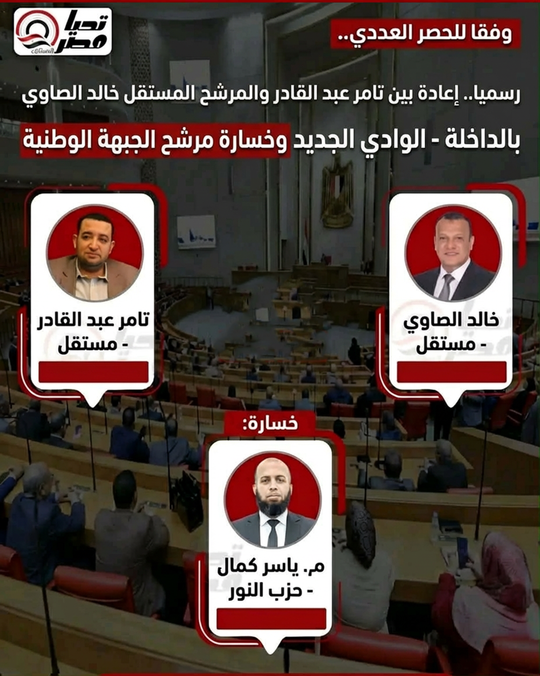 رسميا.. إعادة بين تامر عبد القادر والمرشح المستقل خالد الصاوى بالداخلة