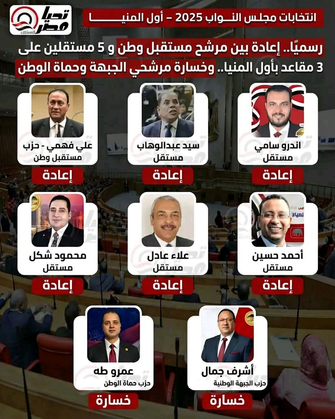 رسميًا.. إعادة بين مرشح مستقبل وطن و 5 مستقلين على 3 مقاعد بأول المنيا.. وخسارة مرشحي الجبهة وحماة الوطن