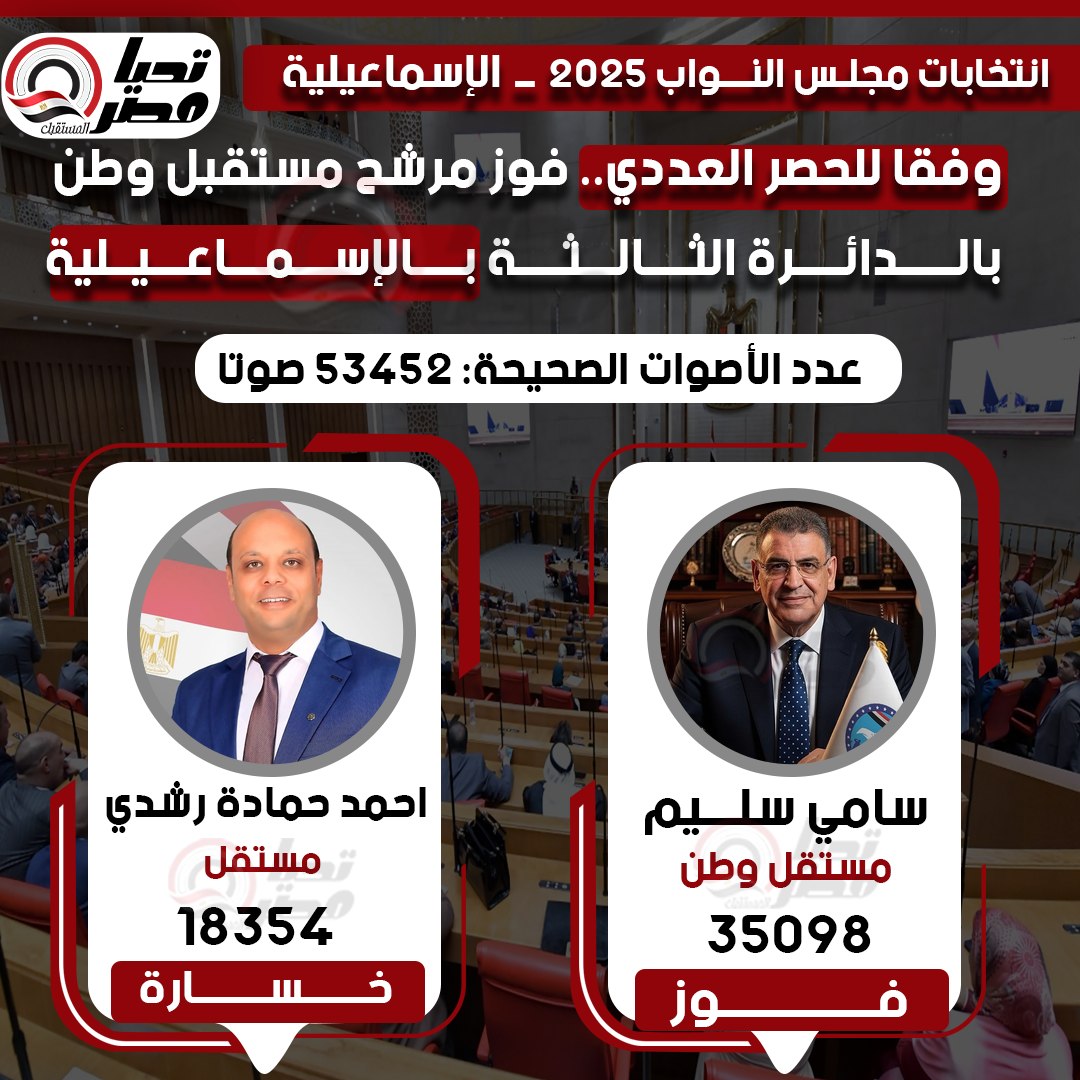 كشف الحصر العددي في الدائرة الثالثة بمحافظة الاسماعيلية ومقرها قسم القصاصين عن فوز مرشح حزب مستقبل سامي سليم بعد تفوقه على المرشح المستقل أحمد حمادة رشدي في عدد الأصوات.