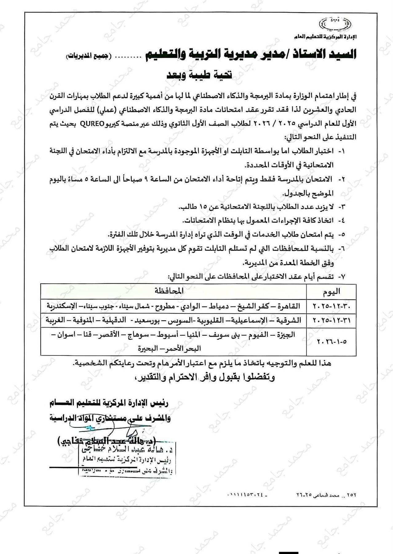ضوابط عقد امتحانات مادة البرمجة والذكاء الاصطناعي عمليا لطلاب الأول الثانوي