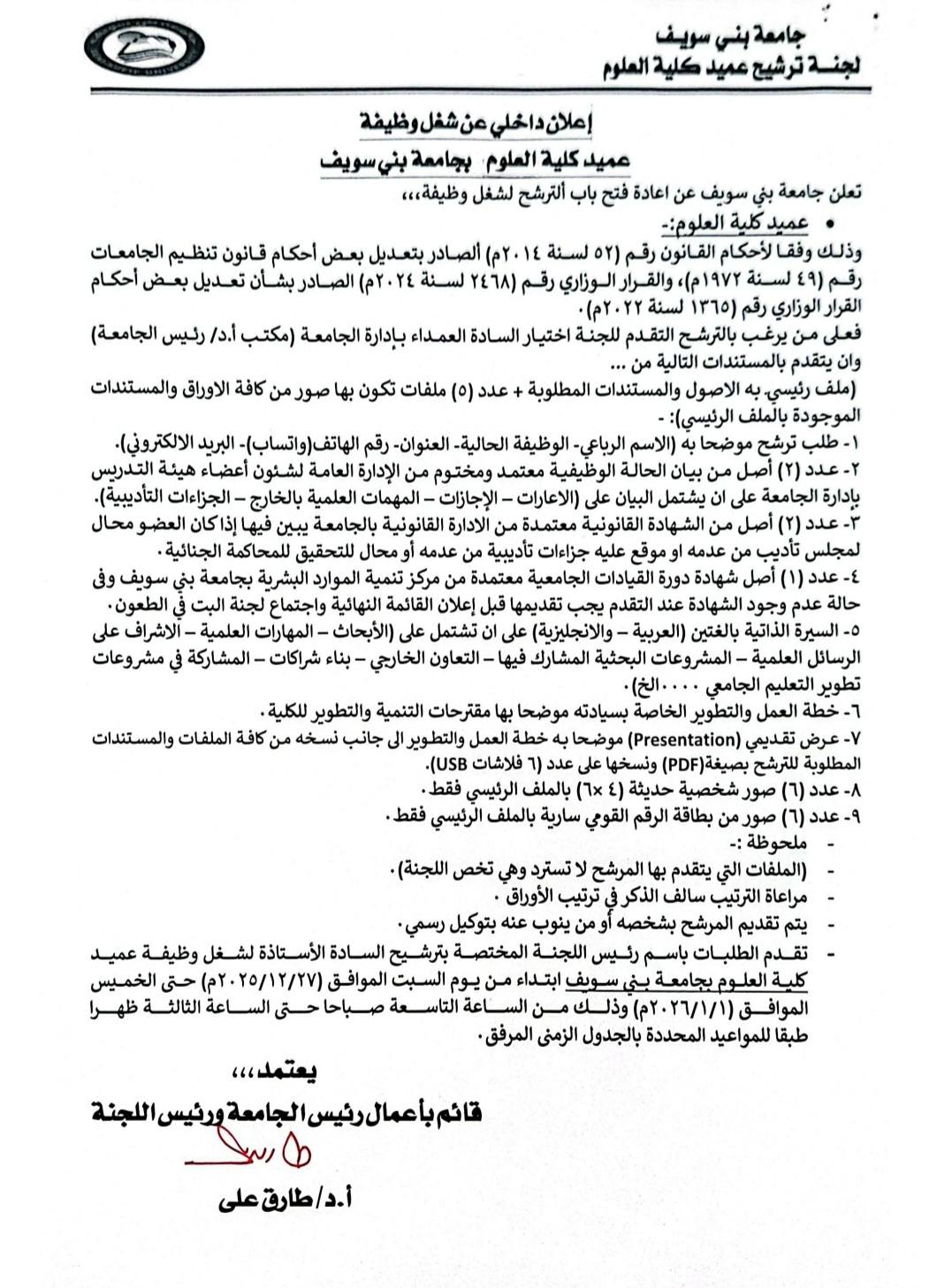 المستندات المطلوبة لشغل منصب عميد كلية العلوم جامعة بني سويف
