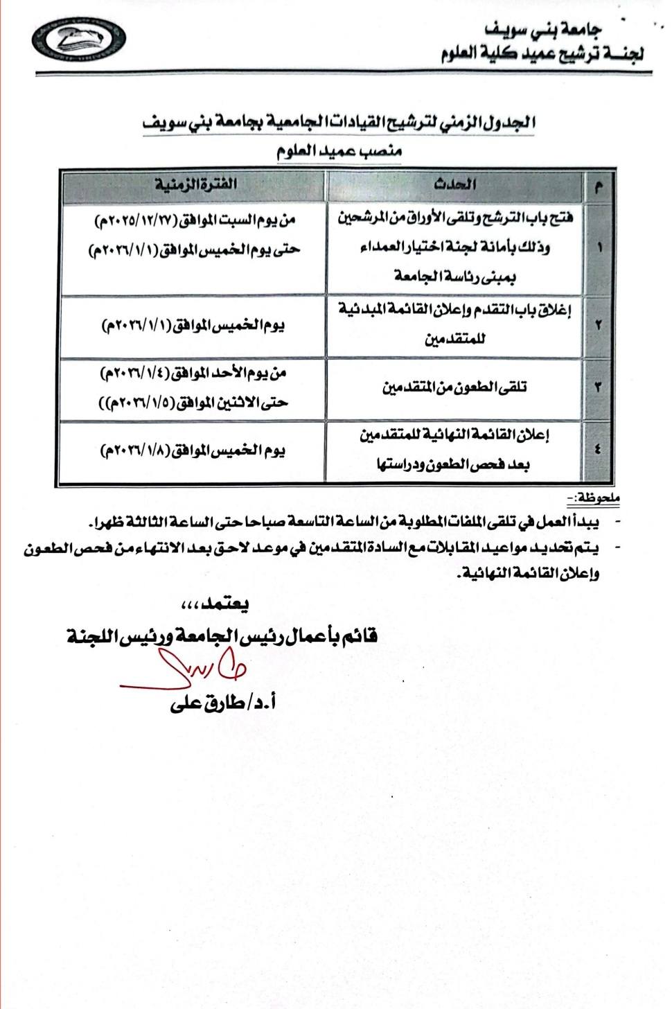 الجدول الزمني للتقدم لشغل منصب عميد كلية العلوم جامعة بني سويف