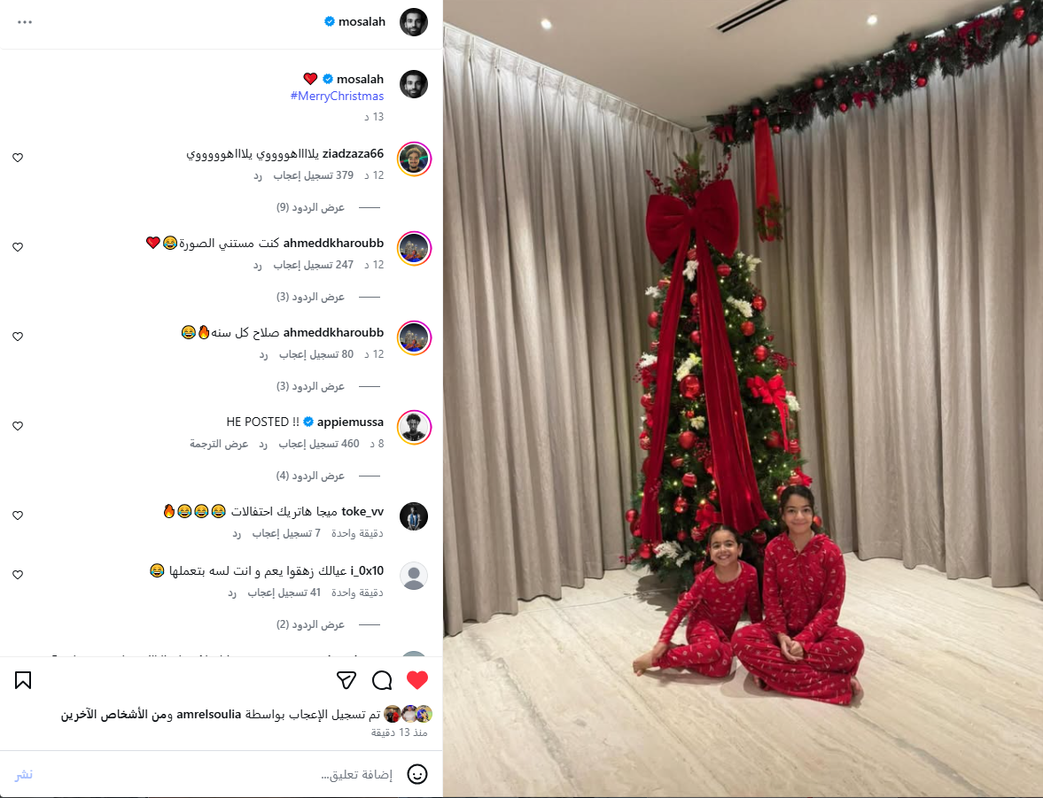 نشر نجم ليفربول الإنجليزي ومنتخب مصر محمد صلاح صوراً لعائلته تحتفل بعيد الميلاد “الكريسماس، على حساباته على وسائل التواصل الاجتماعي يوم 25 ديسمبر 2025.