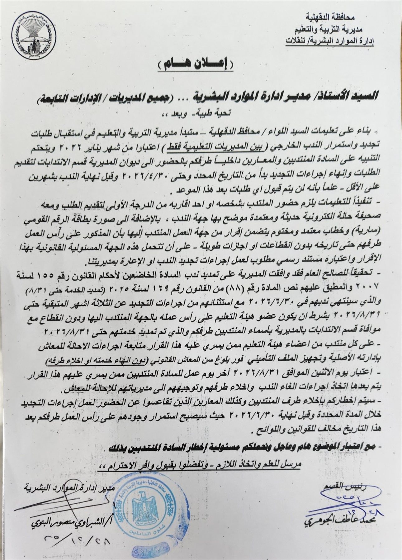 أعلنت مديرية التربية والتعليم والتعليم الفني بمحافظة الدقهلية، بدء استقبال طلبات تجديد واستمرار الندب الخارجي ( بين المديريات التعليمية فقط ( اعتبارا من شهر يناير ٢٠٢٦.