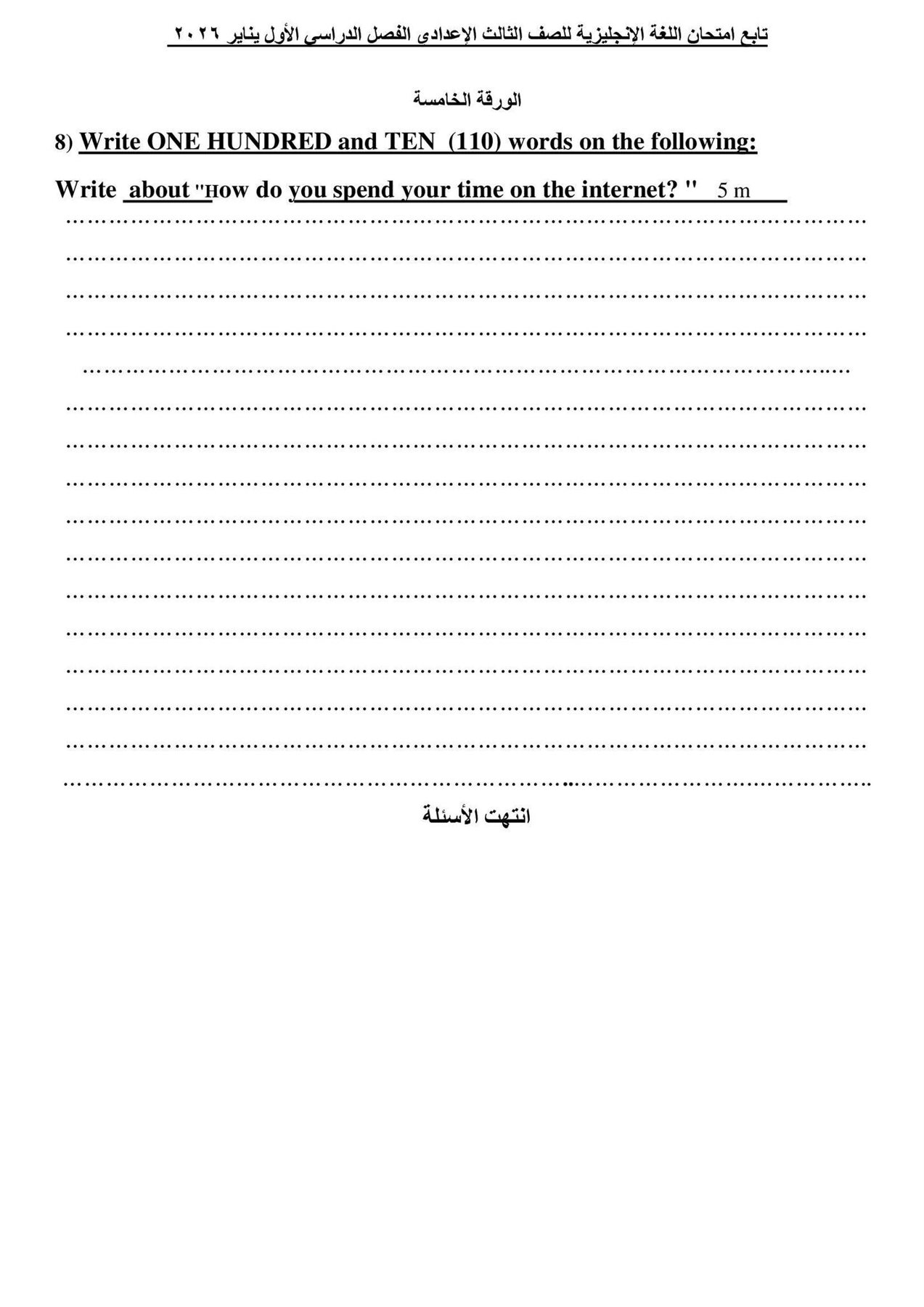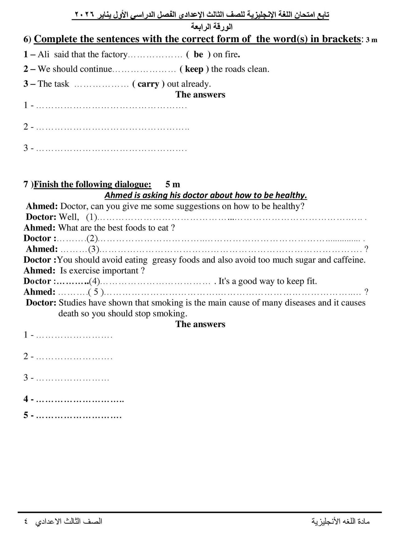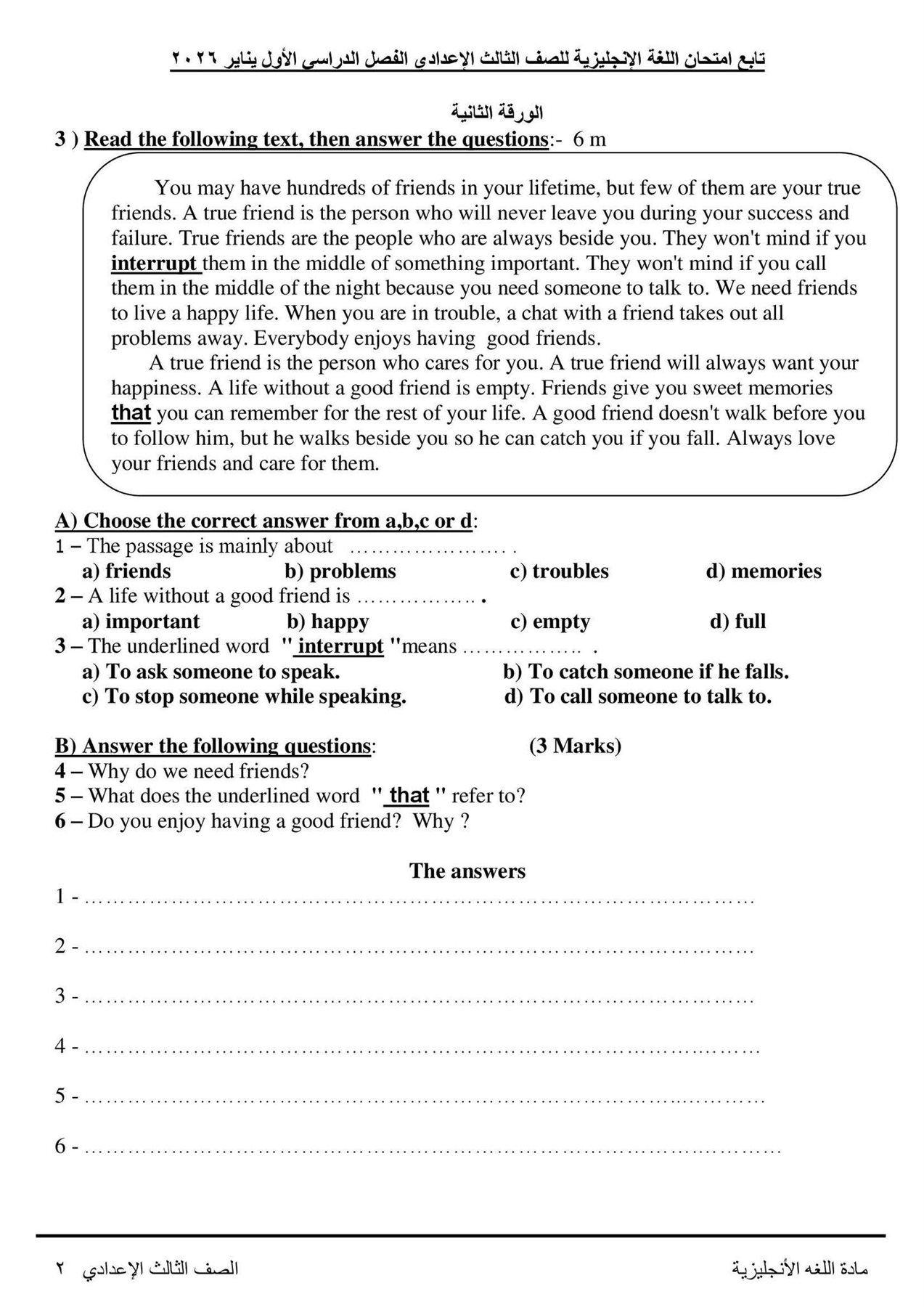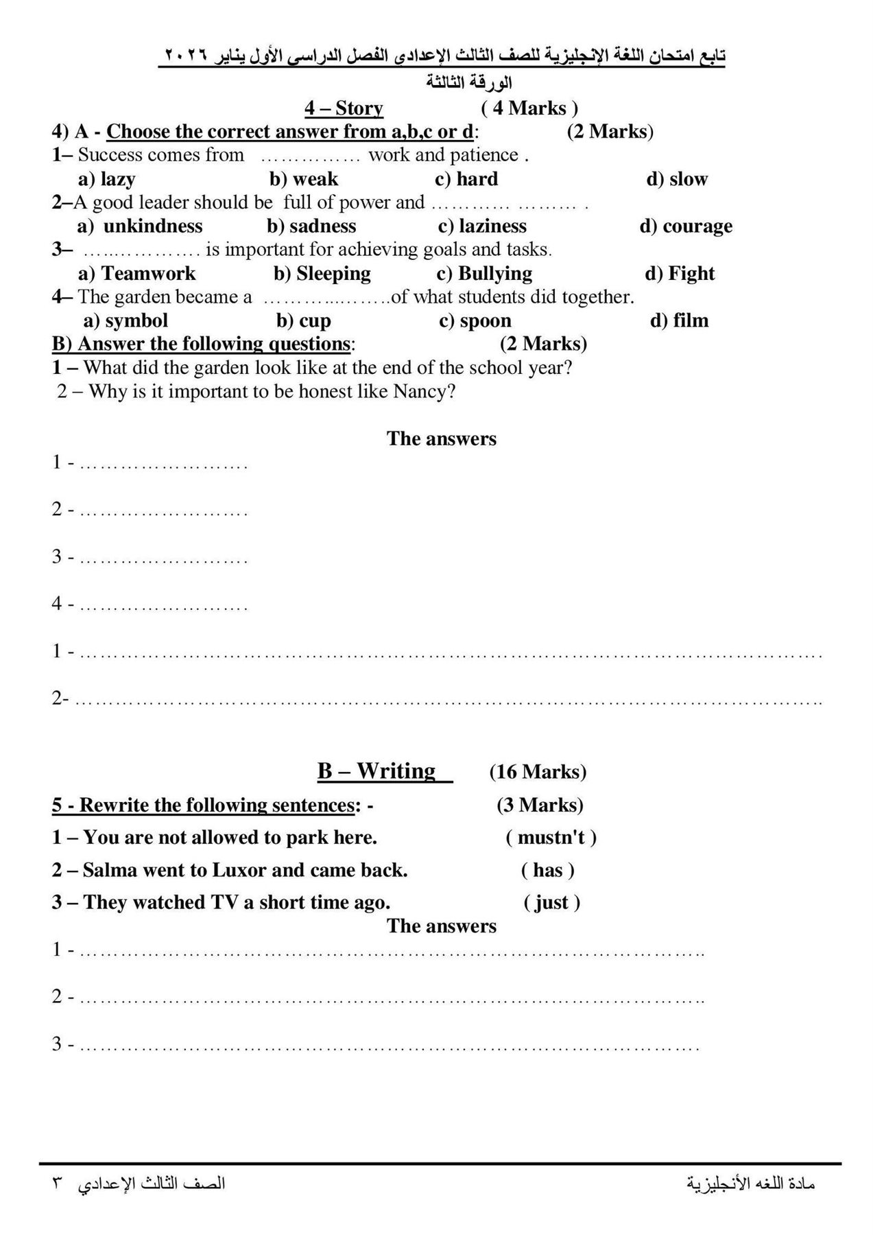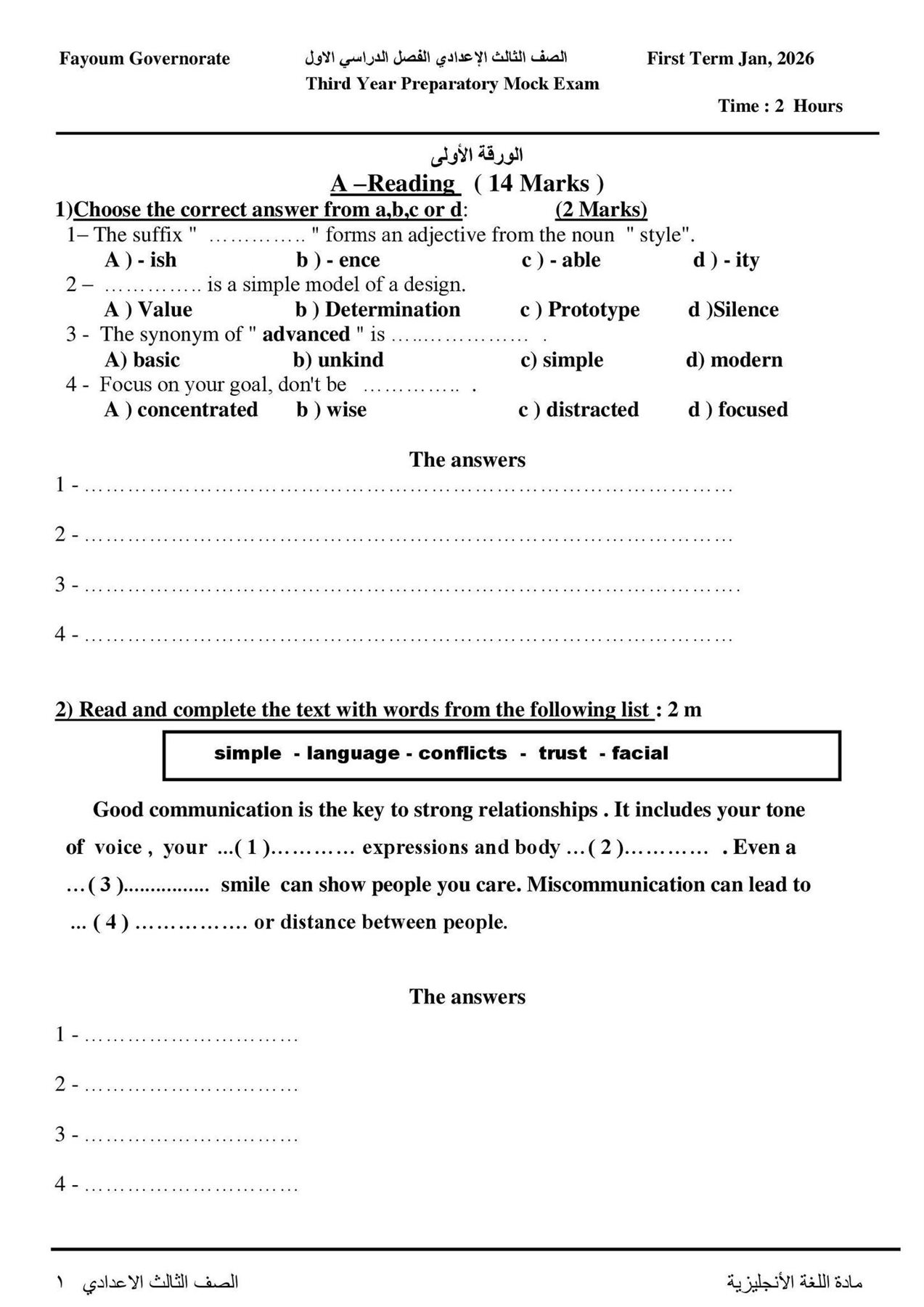 ويمكن الحصول على  نماذج من اختبارات تجريبية لطلاب الشهادة الإعدادية  الفصل الدراسي الأول 2026 – مادة اللغة الإنجليزية من خلال مطالعة الصور التالية: