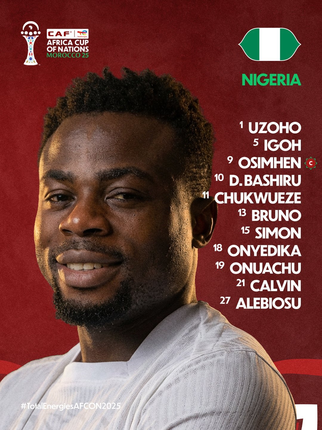 وأعلن الجهاز الفني لمنتخب نيجيريا التشكيل الرسمي الذي سيخوض به مباراة نيجيريا ضد أوغندا، مع إجراء بعض التغييرات على التشكيل الأساسي، بهدف منح الفرصة لعدد من العناصر، وجاء التشكيل على النحو التالي: