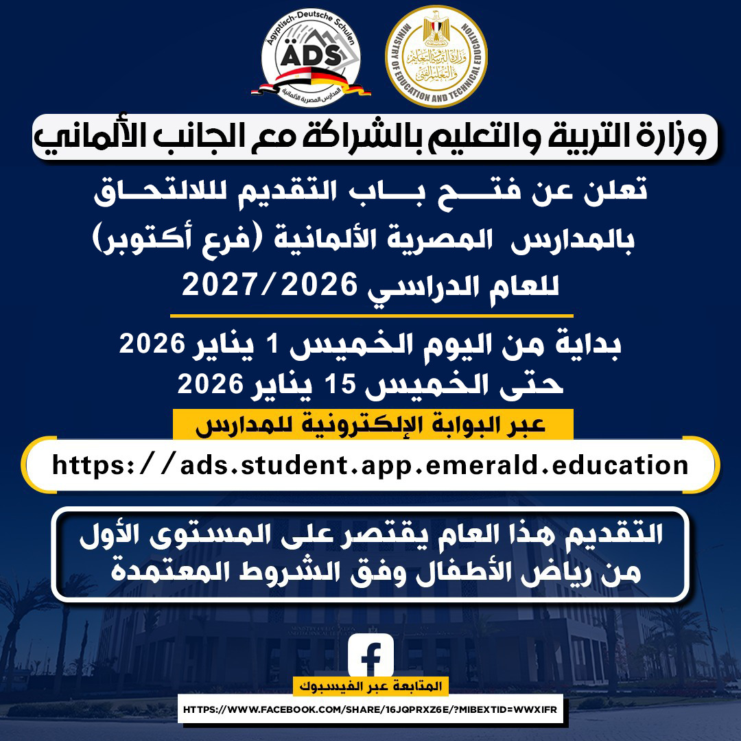 أعلنت وزارة التربية والتعليم والتعليم الفني عن فتح باب التقديم للالتحاق بـ المدرسة المصرية الألمانية – فرع مدينة أكتوبر للعام الدراسي 2026 – 2027، وذلك للمرحلة الأولى من رياض الأطفال (KG1)، لمدة 15 يومًا تبدأ من الخميس 1 يناير 2026 وحتى الخميس 15 يناير 2026.