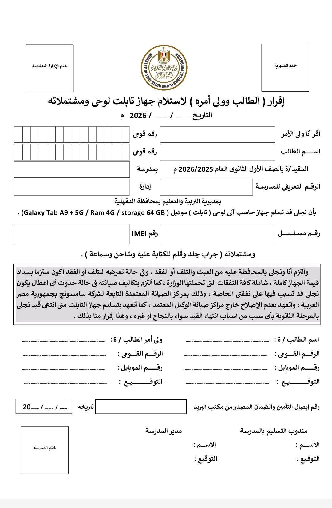 - اقرار استلام التابلت وعلي الطالبة ملء البيانات بدقة وعدم الشطب فيه