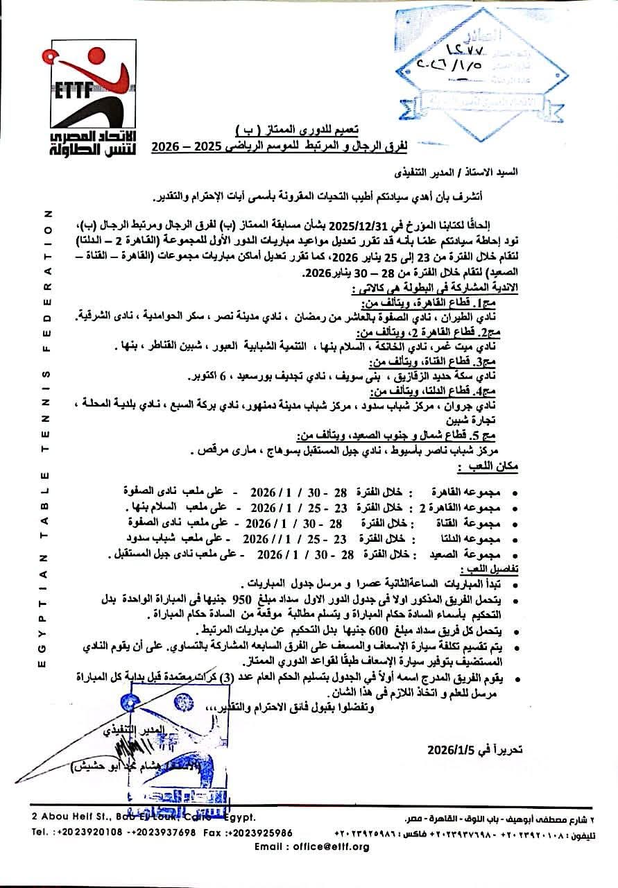 ويأتي هذا التعميم استكمالًا لكتاب الاتحاد السابق المؤرخ في 31 ديسمبر 2025، والمتعلق بتنظيم منافسات الممتاز ب للرجال ومرتبط الرجال.