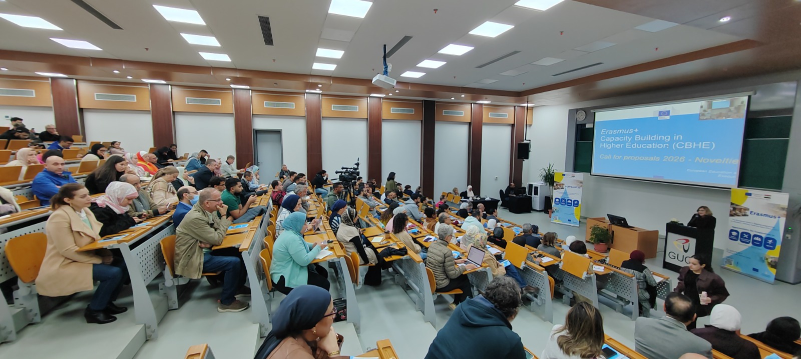 استضافت الجامعة الألمانية بالقاهرة فعالية تعريفية موسعة للتعريف بفرص برنامج إيراسموس لعام 2026 في مصر، بمشاركة الدكتورة سلمى يسري مساعد وزير التعليم العالي والبحث العلمي للتعاون الدولي، وكارلا جيوليتي مستشارة مشاريع، الوكالة التنفيذية الأوروبية للتعليم والثقافة (EACEA)، وإليونورا مارتينيلو، مستشارة مشاريع الوكالة التنفيذية الأوروبية للتعليم والثقافة (EACEA)، والدكتورة زينب الصدر، المنسقة الوطنية لمكتب إيراسموس بلس – مصر، وذلك في إطار الاحتفال بمرور 20 عامًا على توقیع الاتفاقية العلمية والتكنولوجية بين جمهورية مصر العربية والاتحاد الأوروبي، واستکمالًا للتنسيق الجاري لإعداد سلسلة من الفعاليات الداعمة لهذا التعاون الاستراتيجي في مجالات التعليم العالي والبحث العلمي والابتکار.