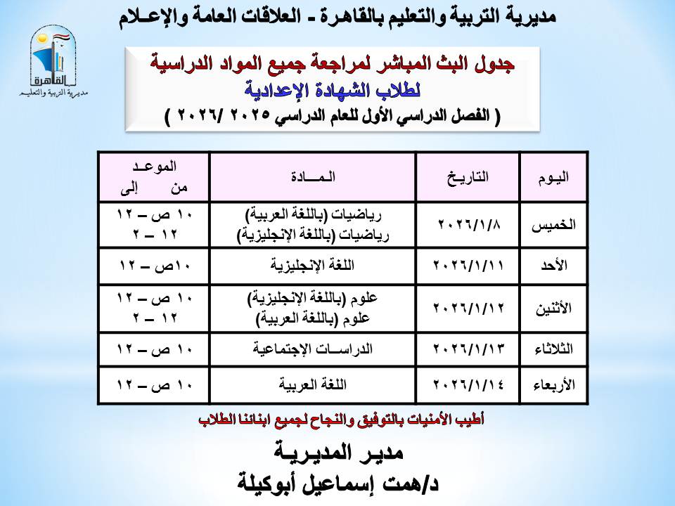 أعلنت مديرية التربية والتعليم بالقاهرة، عن استكمال البث المباشر للمراجعات النهائية لـ الشهادة الإعدادية بالفصل الدراسي الأول للعام الدراسي ٢٠٢٦/٢٠٢٥ وذلك وفقًا للجدول الزمني المعلن.