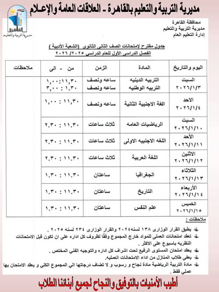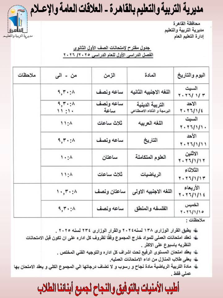 جدول امتحانات الصف الأول والثاني الثانوي الترم الأول 2026 محافظة القاهرة