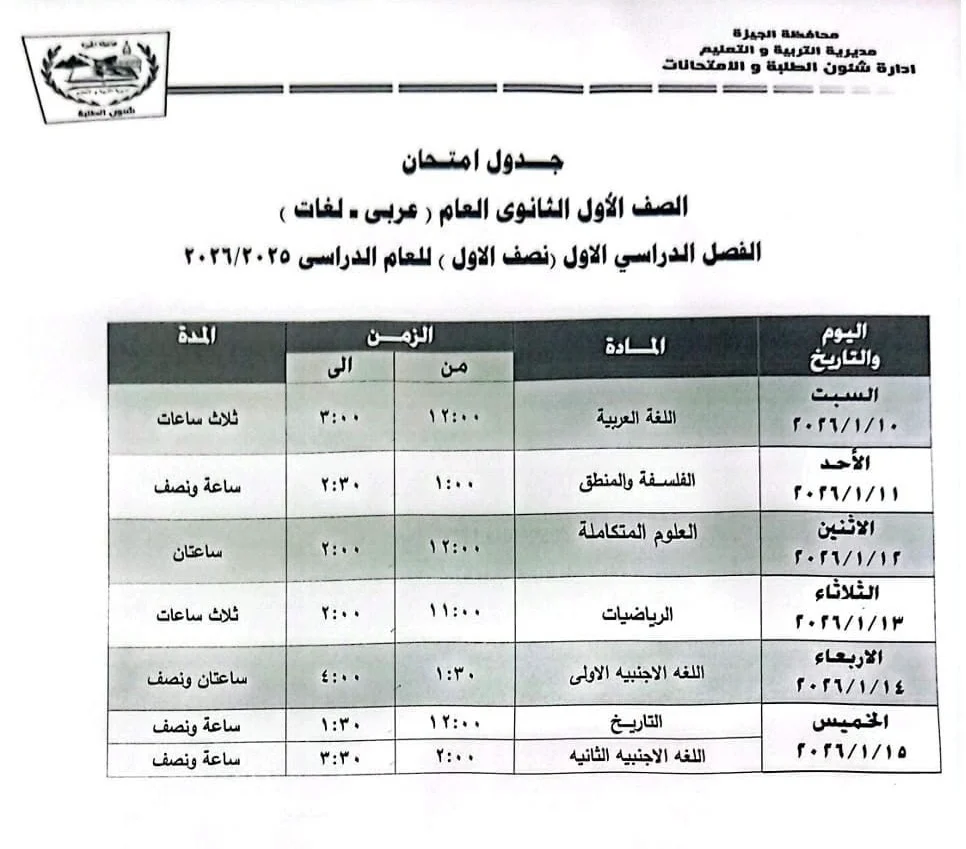 جدول امتحانات الصف الأول والثاني الثانوي الترم الأول 2026 محافظة الجيزة