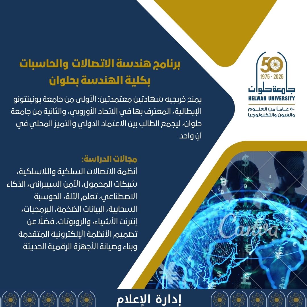 برنامج هندسة الاتصالات والحاسبات بكلية الهندسة جامعة حلوان ليس مجرد شهادة، بل هو رحلة علمية وتجربة دولية تؤهلك لأن تكون مهندسًا عالميًا يحمل أدوات المستقبل.