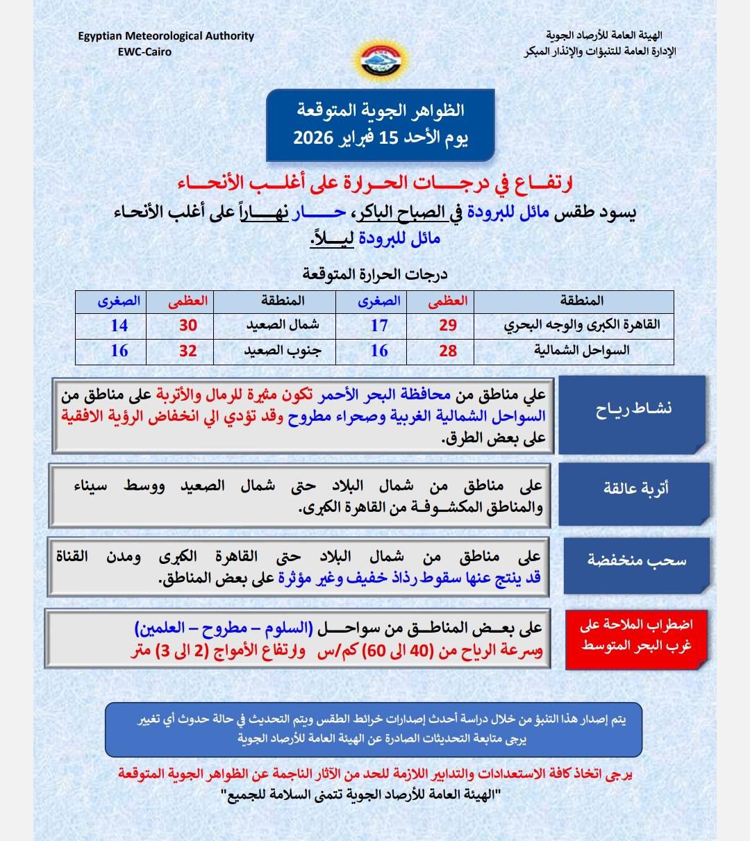 أصدرت الهيئة العامة للأرصاد الجوية بياناً تفصيلياً حول حالة الطقس المتوقعة غداً الأحد الموافق 15 فبراير 2026، كشفت فيه عن تغيرات جوية ملحوظة تشمل ارتفاعاً ملموساً في درجات الحرارة على أغلب أنحاء الجمهورية. وأشارت الهيئة إلى أن البلاد ستمر بموجة من الطقس المتقلب تتطلب من المواطنين الحذر الشديد في التعامل مع الظروف الجوية المتغيرة على مدار اليوم.