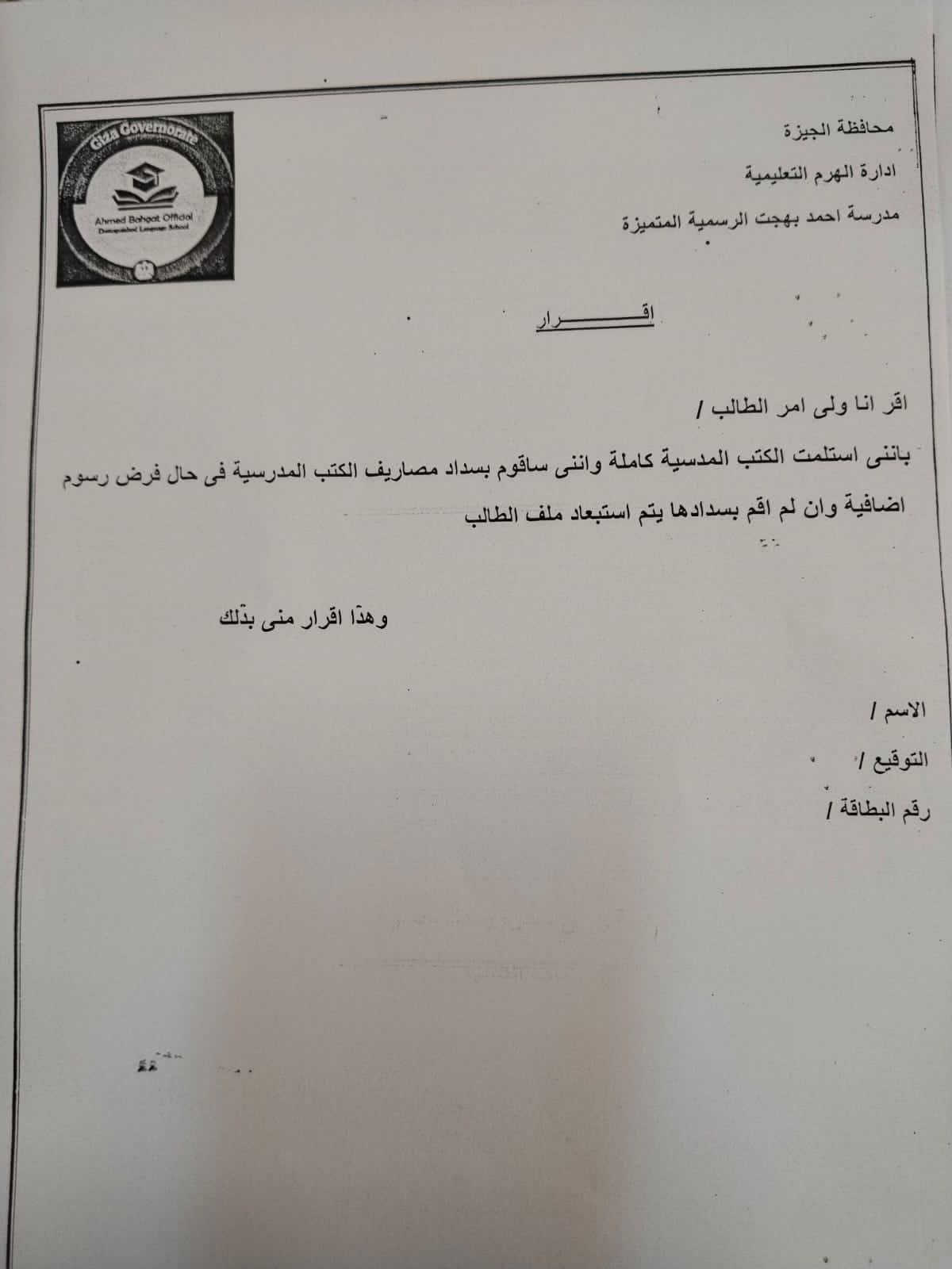 ألزمت مدرسة أحمد بهجت الرسمية المتميزة للغات، التابعة لإدارة الهرم التعليمية بمحافظة الجيزة، أولياء الأمور، بالتوقيع على إقرار باستلام الكتب المدرسية كاملة وسداد مصاريفها في حال فرض أي فرض رسوم إضافية عليها، وإلا سيتم استبعاد ملف الطالب.