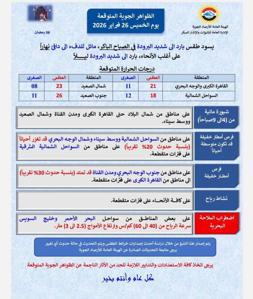 أصدرت الهيئة العامة للأرصاد الجوية بياناً تفصيلياً حول حالة الطقس المتوقعة غداً الخميس، محذرة من تغيرات في الظواهر الجوية تشهدها البلاد، مع استمرار تذبذب درجات الحرارة بين الارتفاع والانخفاض الطفيف على مختلف الأقاليم المصرية، تزامناً مع الأيام المباركة من شهر رمضان.