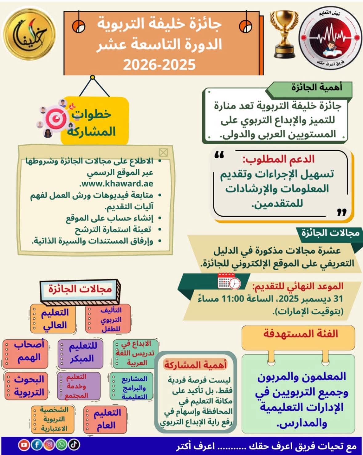 دعت وزارة التربية والتعليم والتعليم الفني، المعلمين، للمشاركة في جائزة خليفة التربوية (الدورة 19: 2025 – 2026) لتعزيز التميز والإبداع التربوي.
